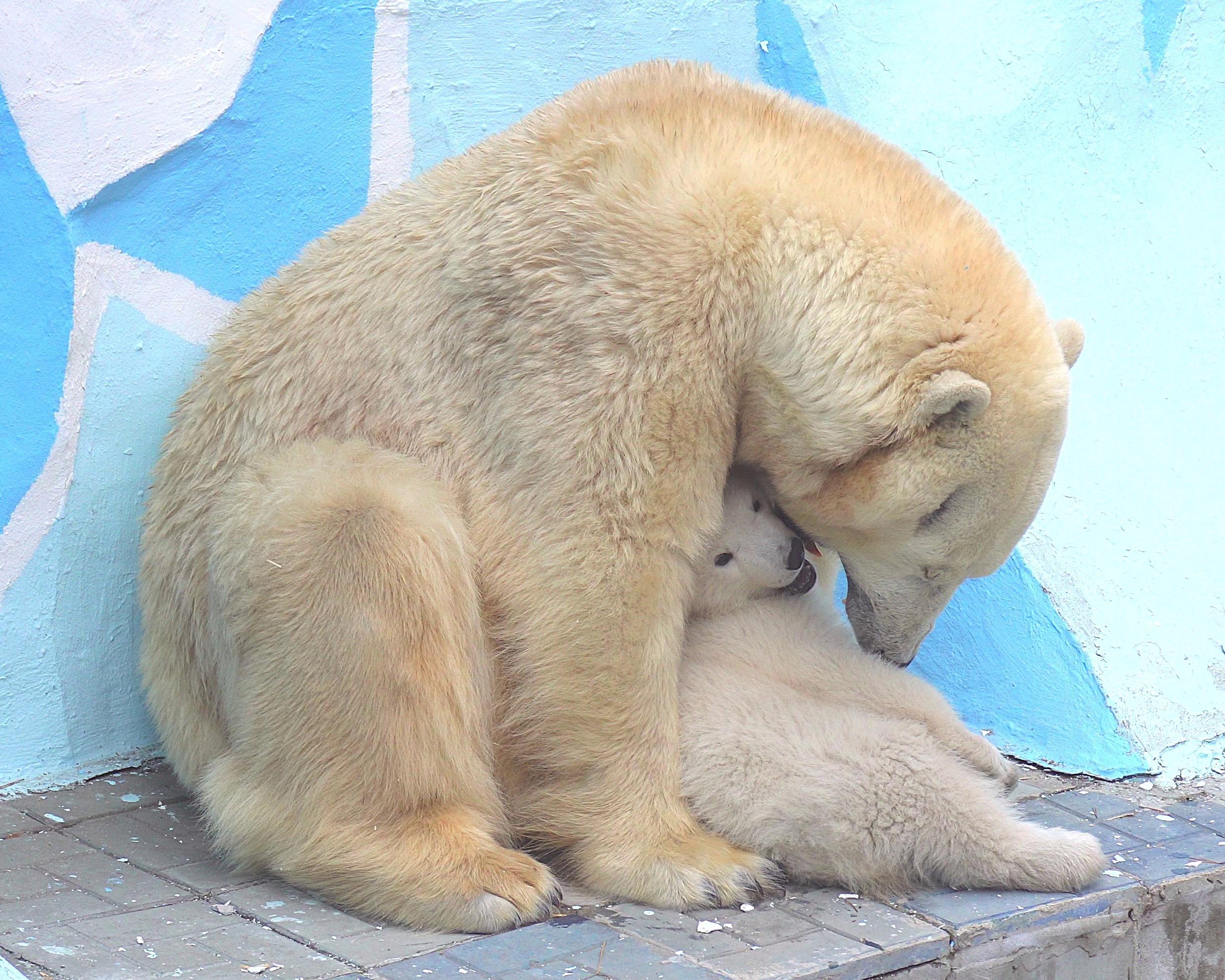 В Новосибирском зоопарке белая медведица по имени Герда вышла на открытую площадку, чтобы покормить своего медвежонка. Детеныш, испытывая голод, активно требовал материнского молока.