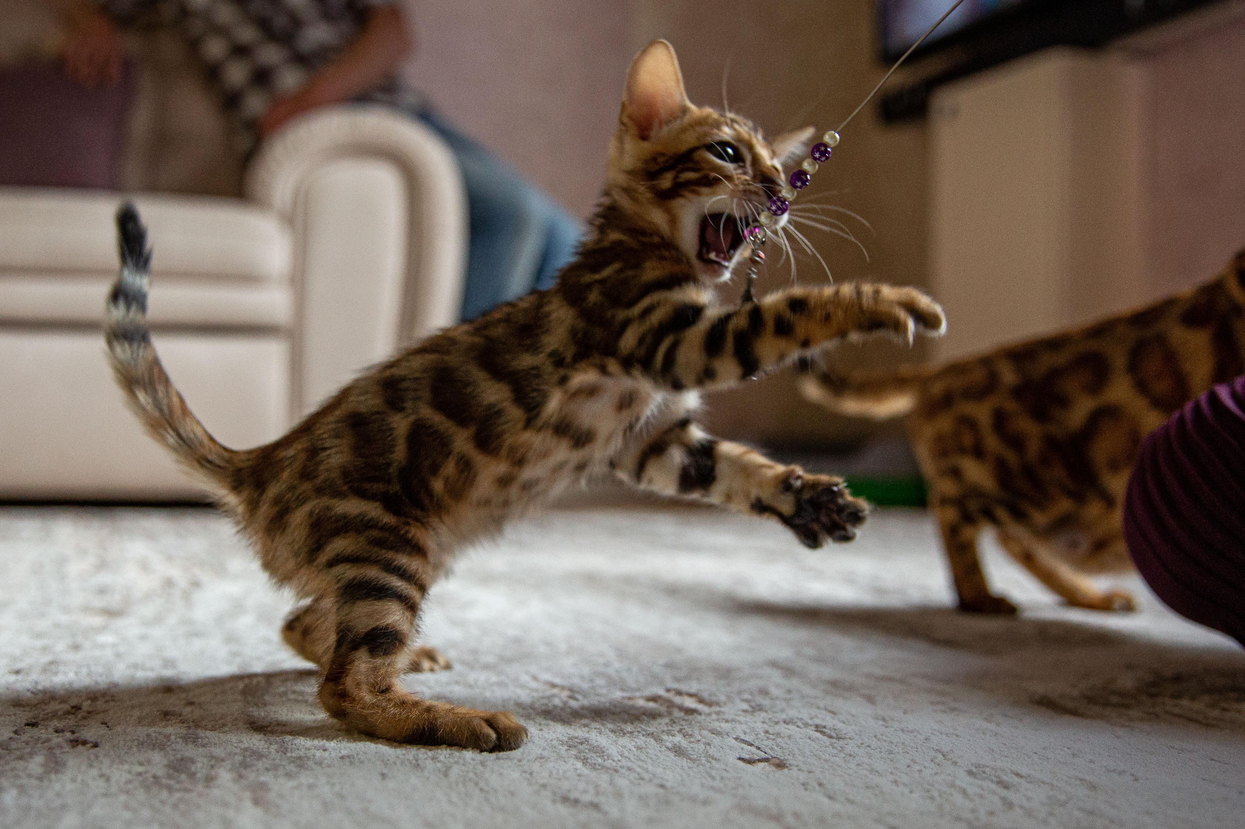 - Бенгальская кошка отличается блестящей короткой шерстью, плотно прилегающей к телу. Выпавшие волоски образуют видимые комочки, которые просто убрать вручную.