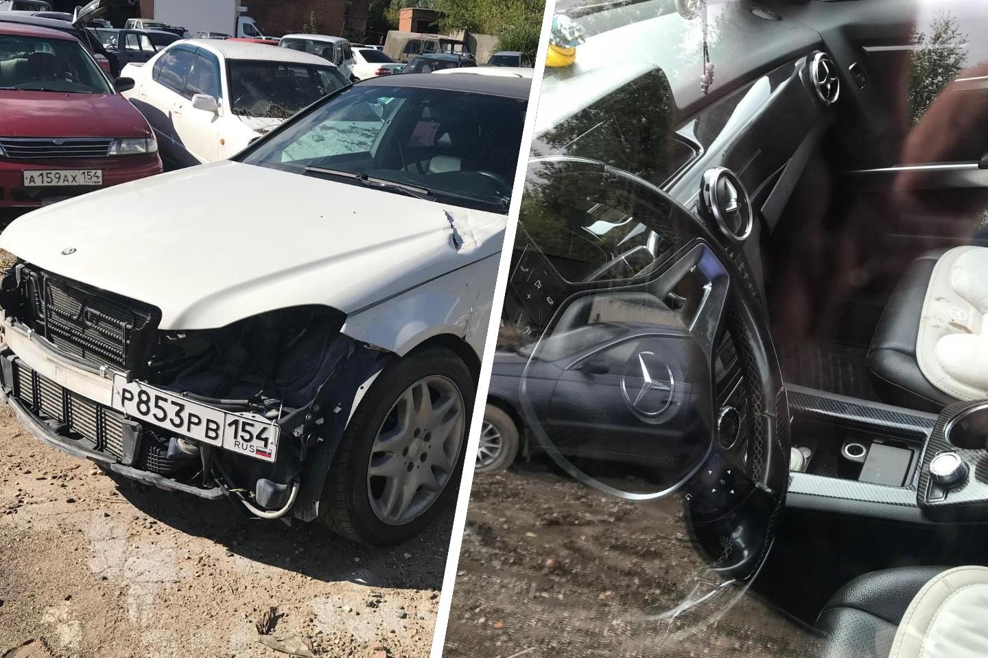 На первом снимке показан Mercedes-Benz с отсутствующими деталями. Вторая фотография демонстрирует салон другого автомобиля.
