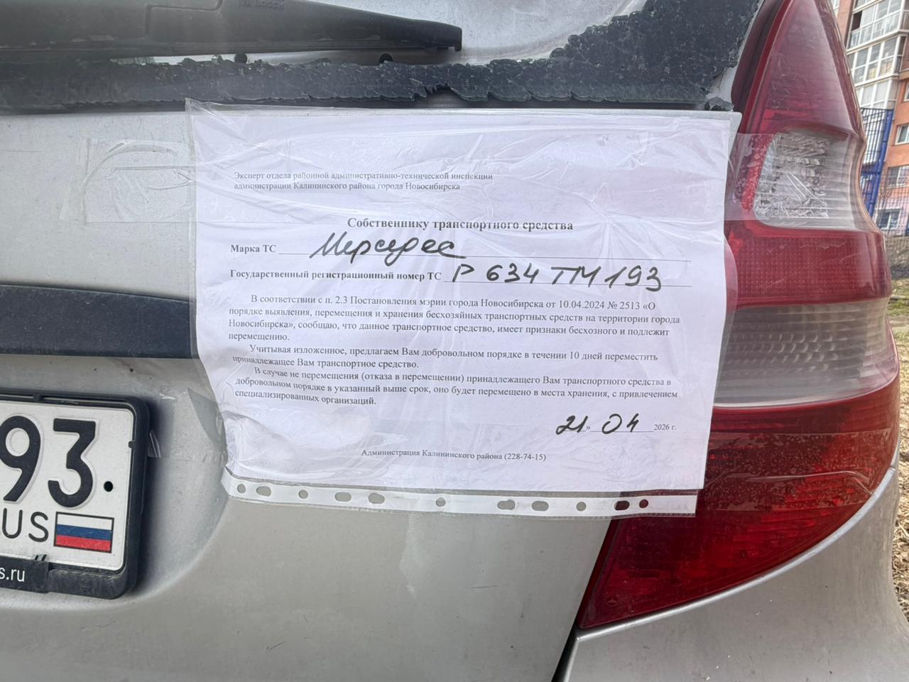В ходе подготовки материала на Mercedes появилось официальное предупреждение от администрации Калининского района. В документе, приклеенном к машине, указано требование убрать транспортное средство в течение десяти дней, в противном случае его обещали эвакуировать.
