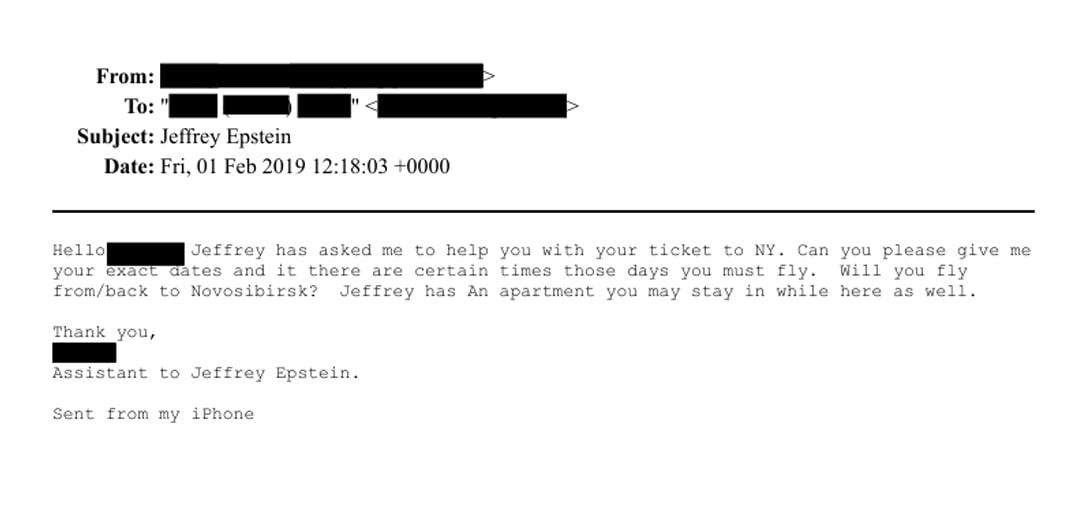 В одном из писем ассистент Эпштейна договаривается о перелёте из Новосибирска в Нью-Йорк.