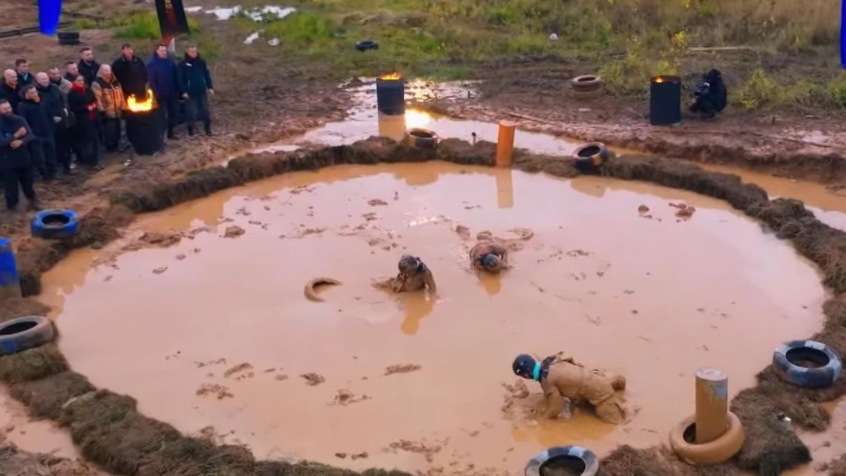 Участников поместили в ров с холодной грязью.