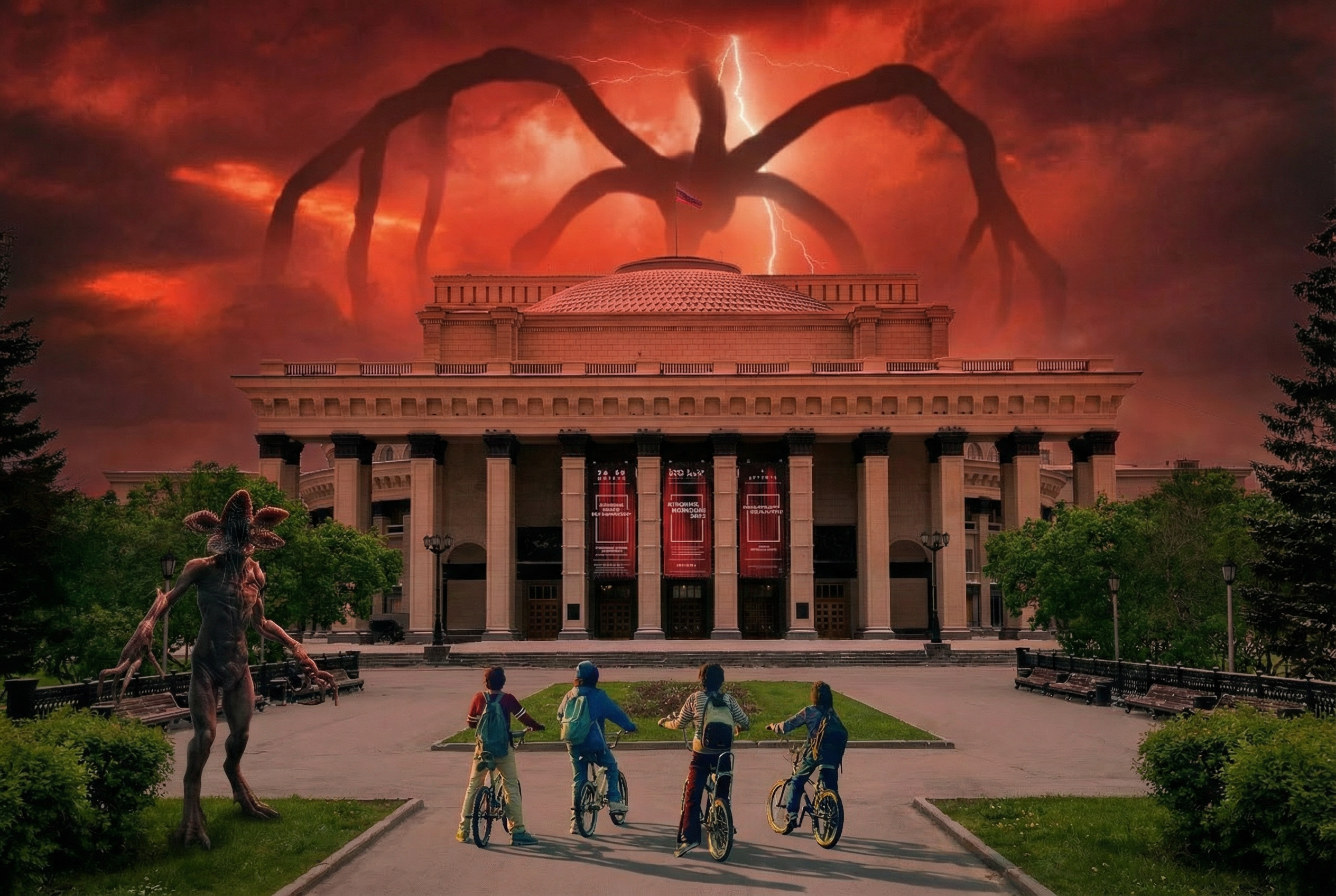 После выхода новой части сериала «Очень странные дела» интернет заполнили изображения, созданные нейросетями в стиле параллельного мира. Вторая половина финального сезона появится 25 декабря, и, следуя тренду, мы тоже использовали искусственный интеллект. Однако мы не стали ограничиваться одним проектом, а перенесли в Новосибирск героев из разных известных сериалов. Город редко становится съёмочной площадкой, но некоторые персонажи идеально вписались в местные виды.