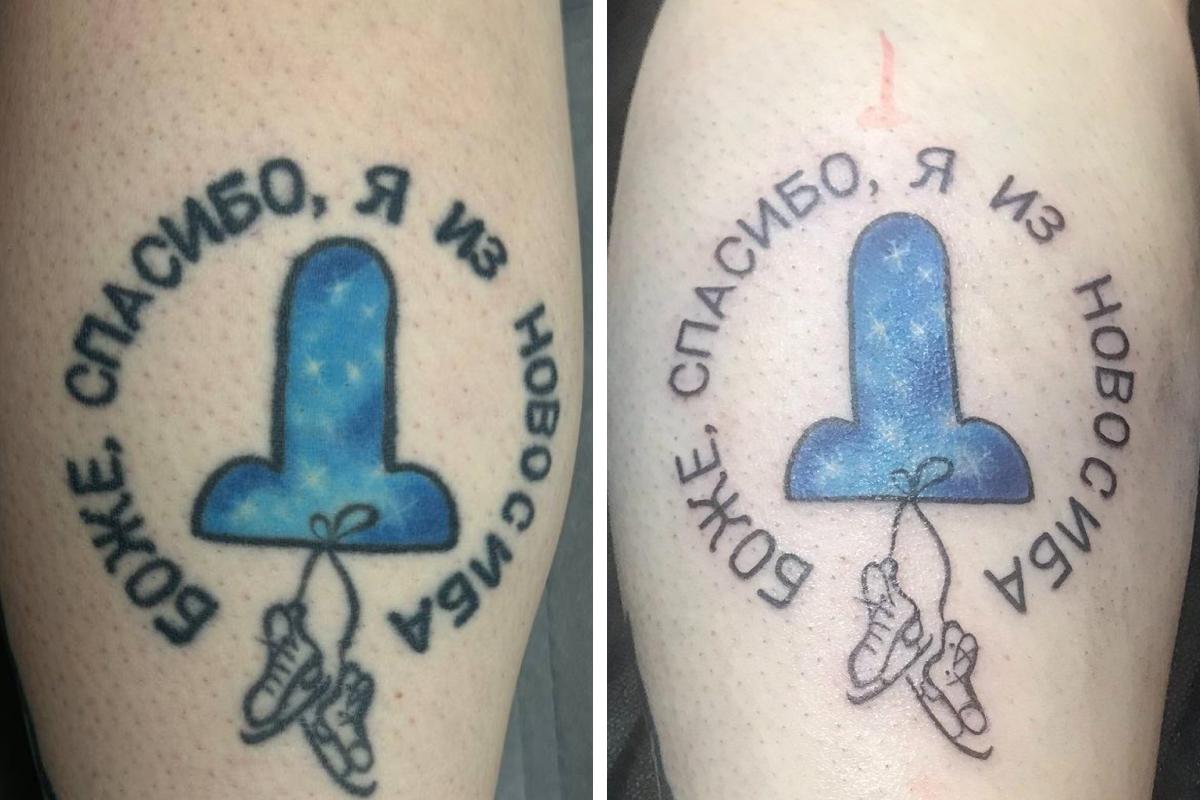 Татуировка на ноге: слева — её современное состояние, справа — фотография 2020 года сразу после нанесения.