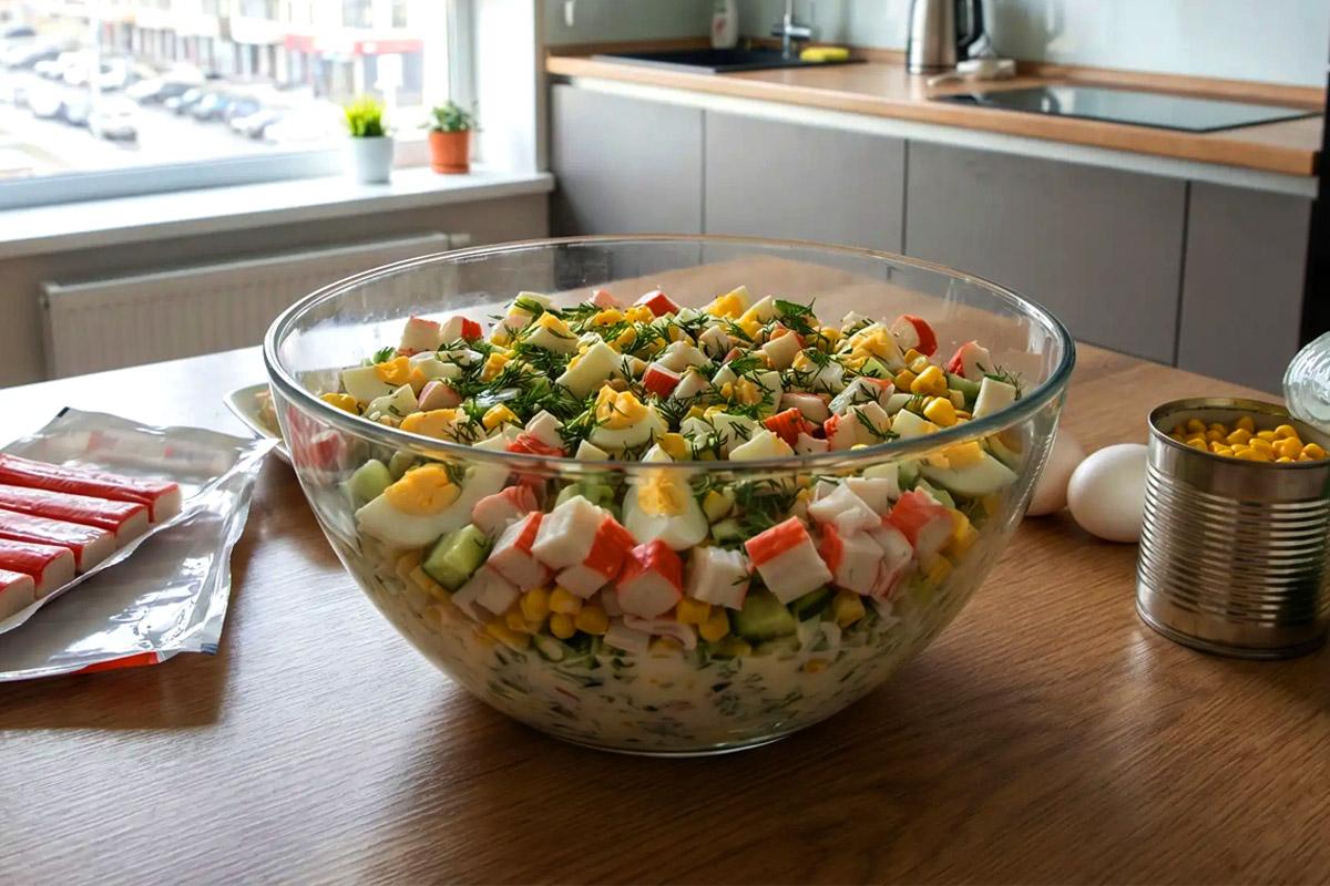 Крабовый салат выручает в любой ситуации. Это вкусное и сытное блюдо, которое готовится просто и быстро. Оно подходит для семейного ужина, внезапного визита гостей или праздничного стола.