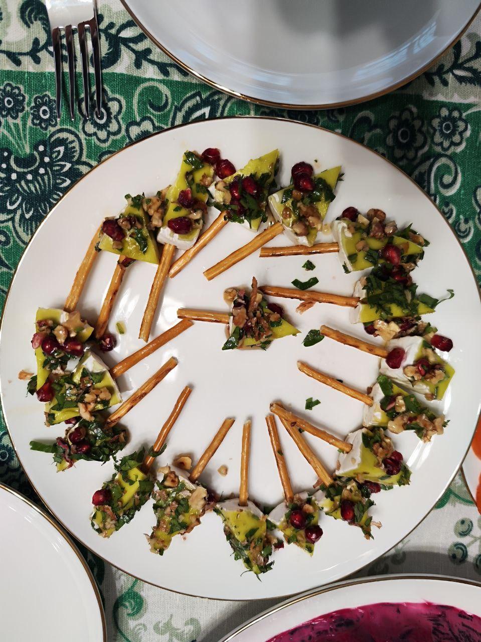 Наталья продемонстрировала закуску из сыра камамбер, которая напоминала миниатюрные ёлочки и подавалась к шампанскому.