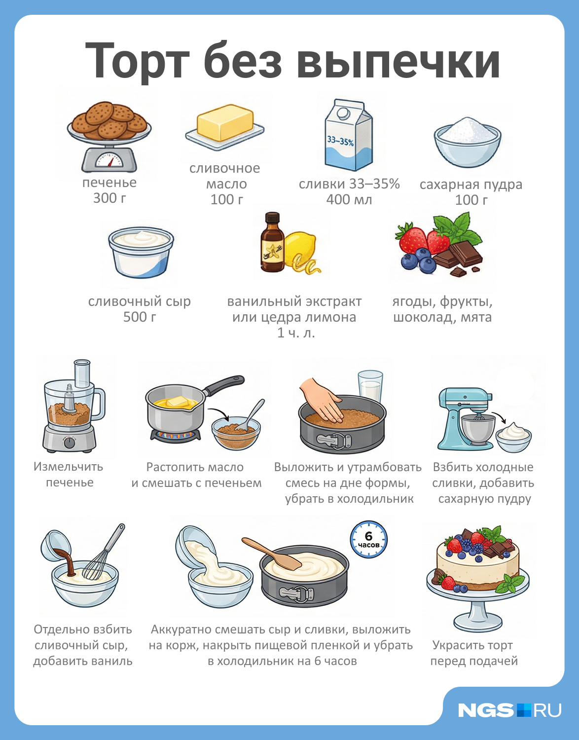 Секрет этого десерта — контраст текстур: хрустящая основа идеально сочетается с нежным кремом. Сливочный сыр дает легкую кислинку, а взбитые сливки — воздушность. Торт тает во рту, не оставляя тяжести, и позволяет проявить творчество в украшении.