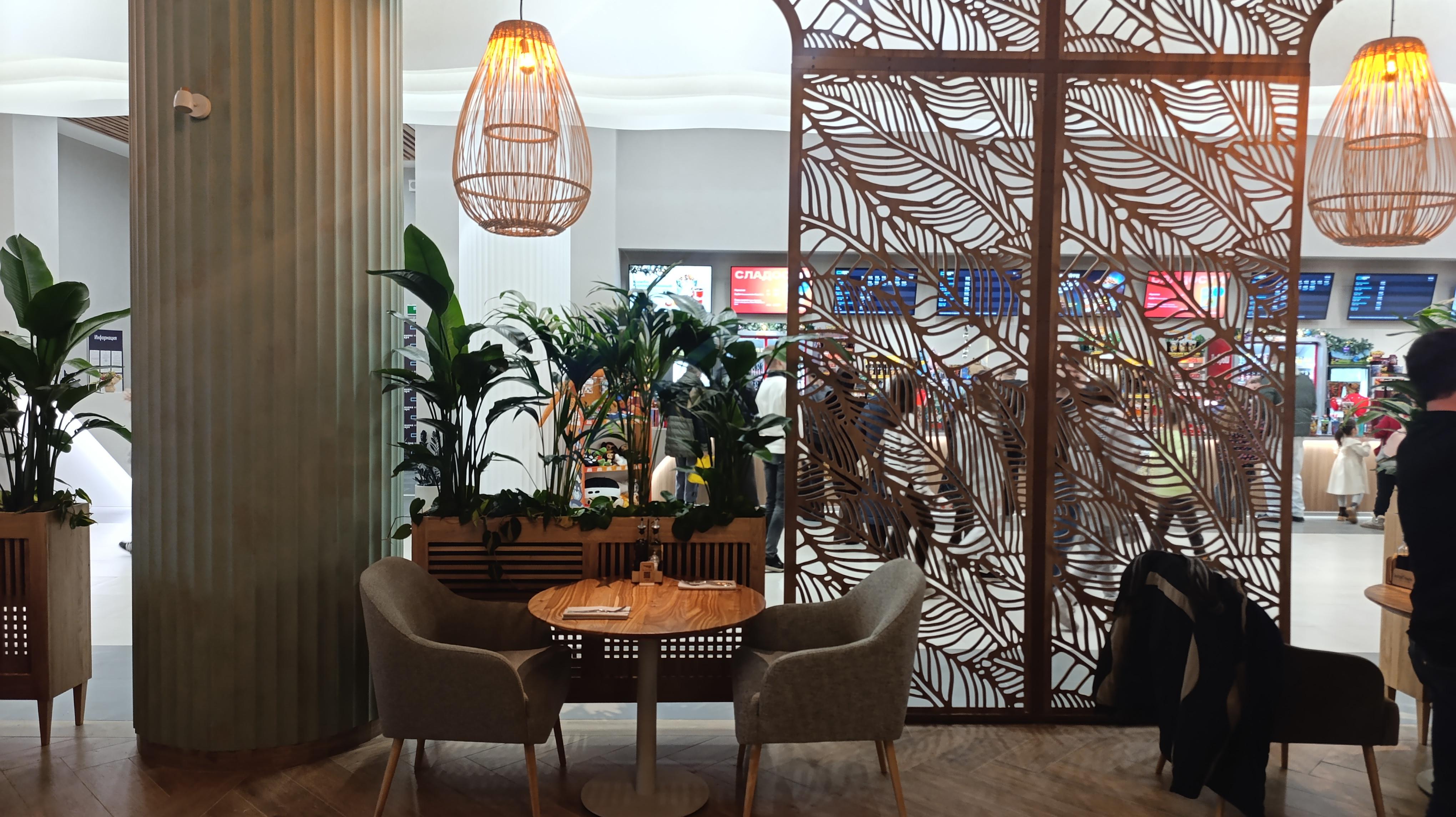 Заведение расположено на территории кинотеатра «Синема парк» и не отгорожено от зоны продажи билетов, где проходят зрители. Из плюсов — просторная детская игровая площадка.