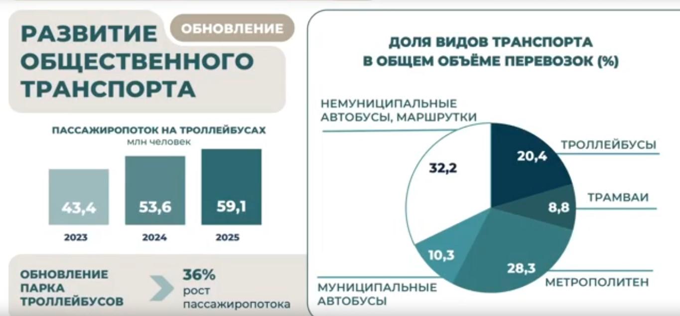 Однако проблема износа сетей сохраняется: в прошлом году отремонтировали 6 км трамвайных путей. Также в метрополитене открылась станция «Спортивная», а на линии появились новые пятивагонные составы «Ермак».