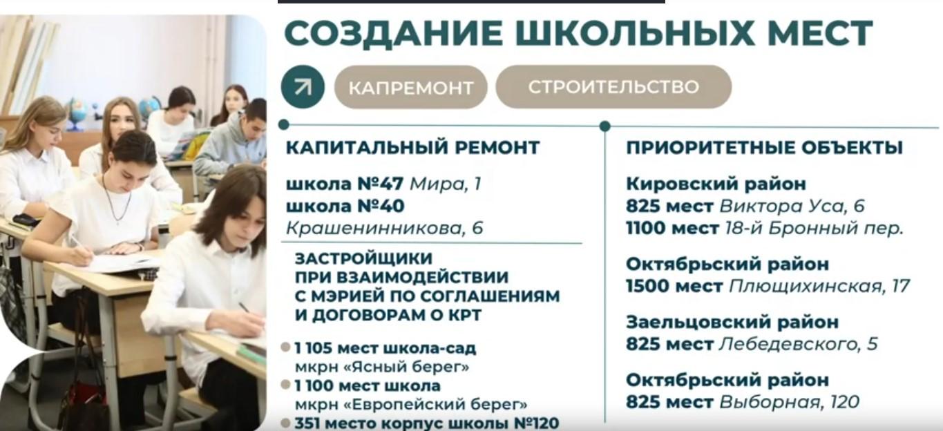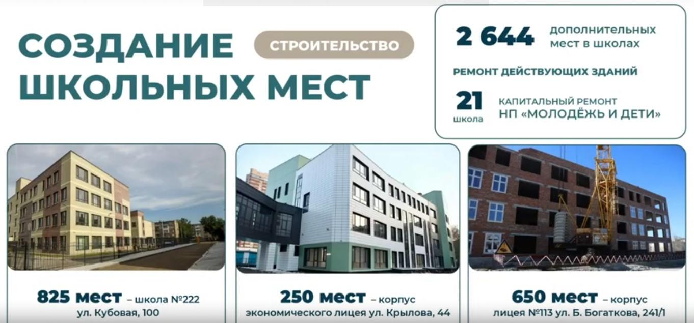 В 2025 году создали более 2 644 новых школьных мест. Капитально отремонтировали 20 учреждений, построили новую школу на улице Кубовой и завершили дополнительный корпус экономического лицея на улице Крылова.