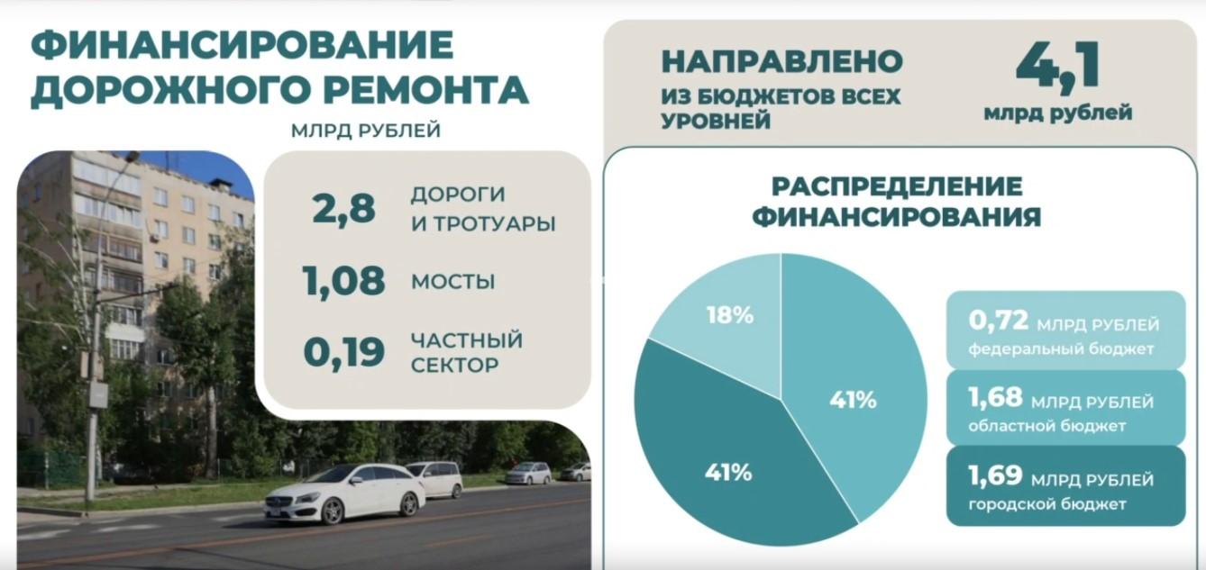 На дорожную инфраструктуру в 2025 году направили 4,1 млрд рублей. Из них 2,8 млрд потратили на дороги и тротуары, 1,08 млрд — на ремонт мостов, 190 млн — на улицы в частном секторе. Отремонтировали более 50 км городских дорог, 108 участков тротуаров, 160 участков в частном секторе и четыре моста.