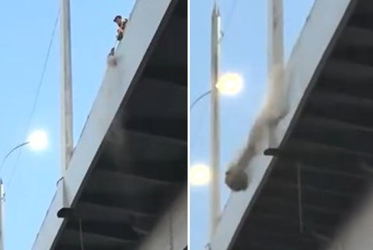 На записи видно, как пыль с моста ссыпают в воду. Съёмка велась в утренние или вечерние часы.