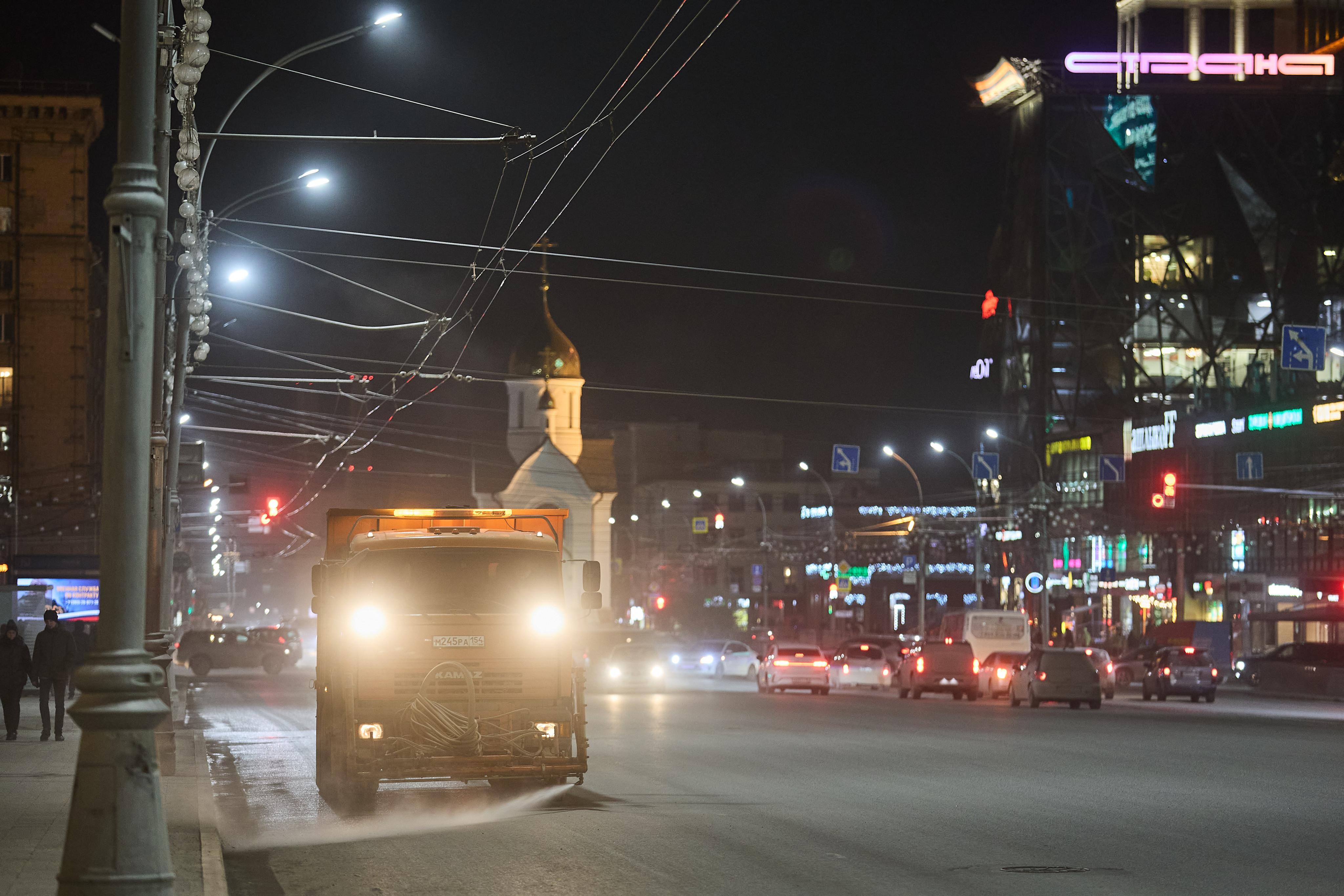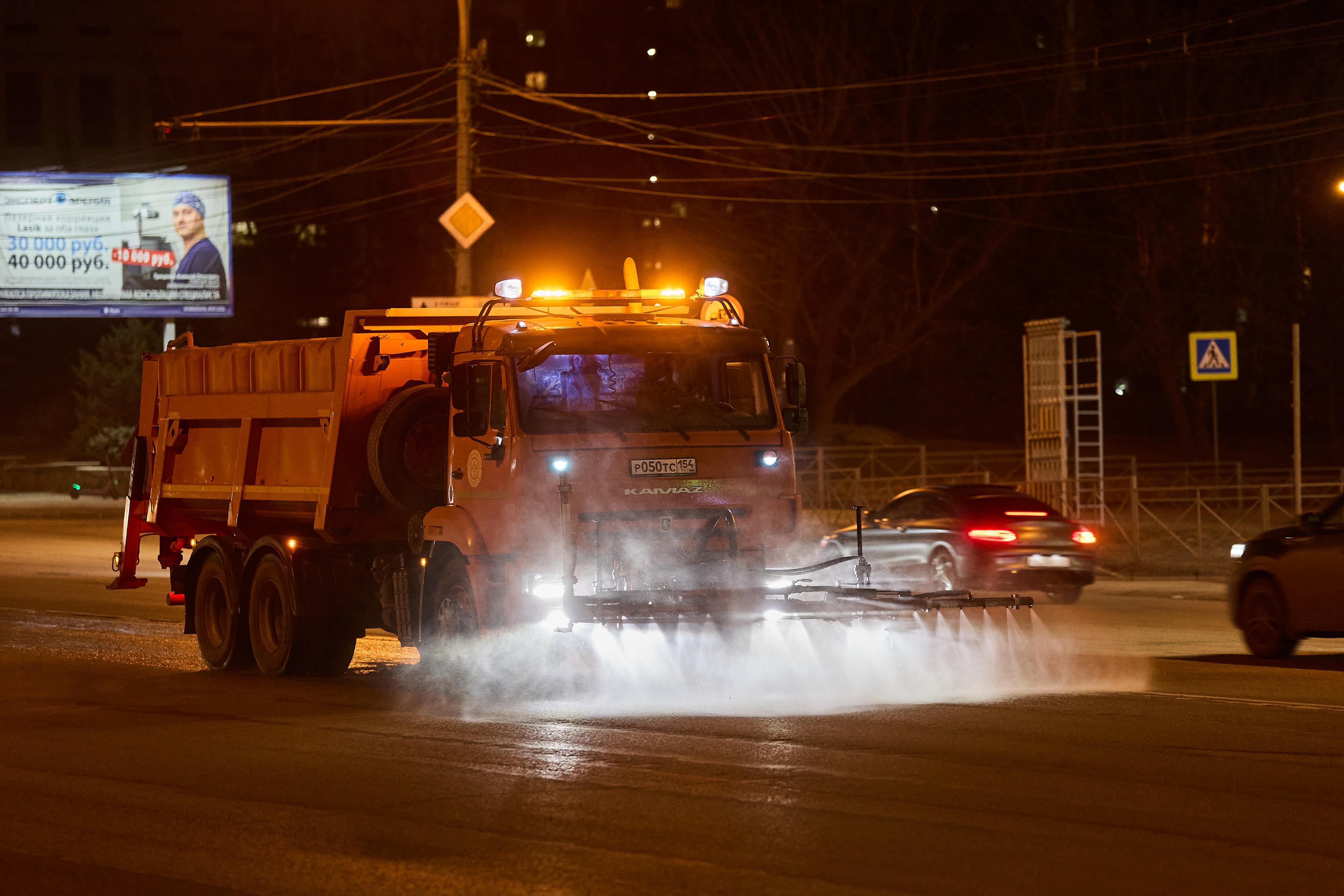 Мойка улиц продолжается и в вечерние часы.