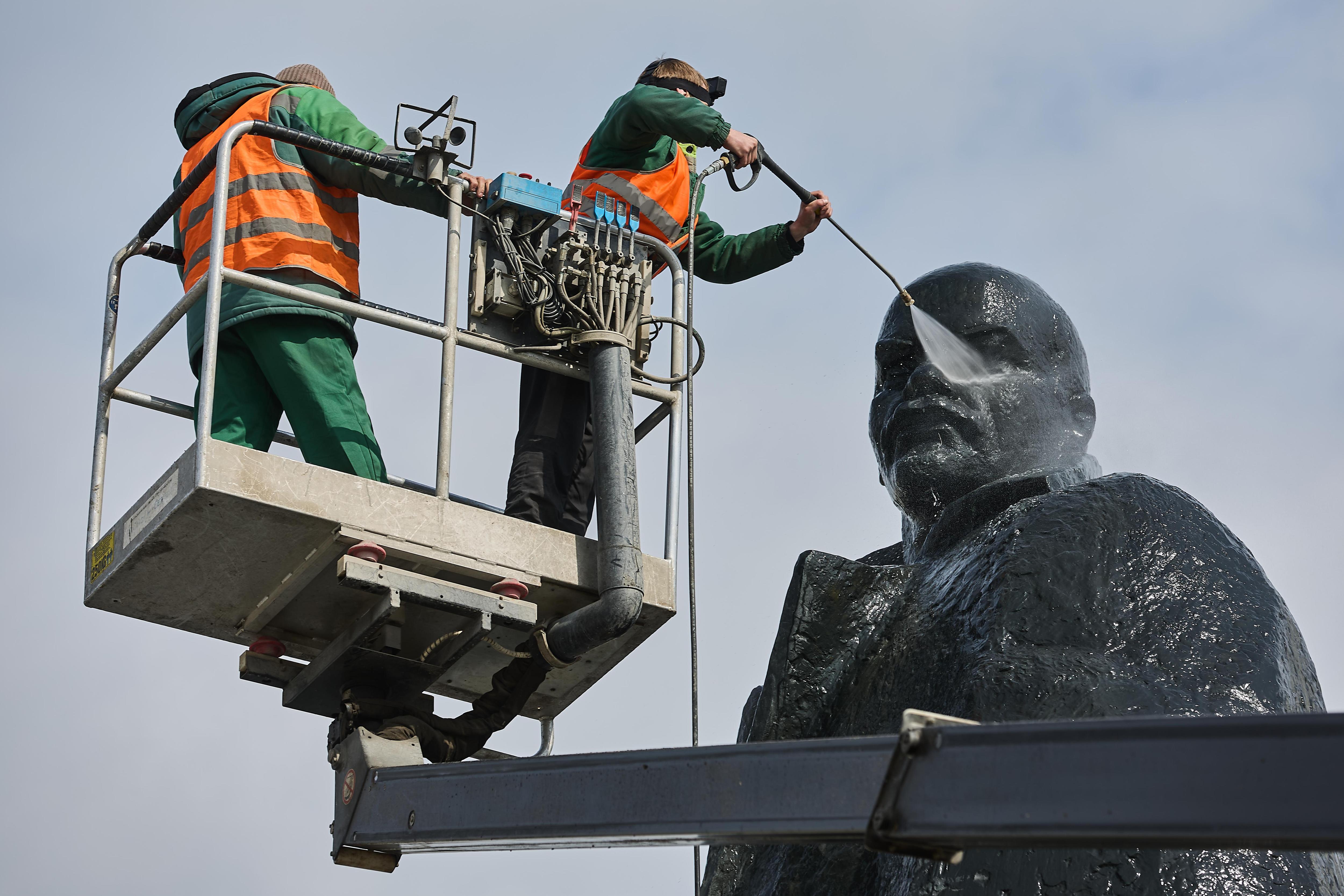 Муниципальное учреждение «Горзеленхоз» приступило к ежегодной весенней уборке. Специалисты начали с помывки елей и шестиметровой скульптуры Владимира Ленина на центральной площади города.