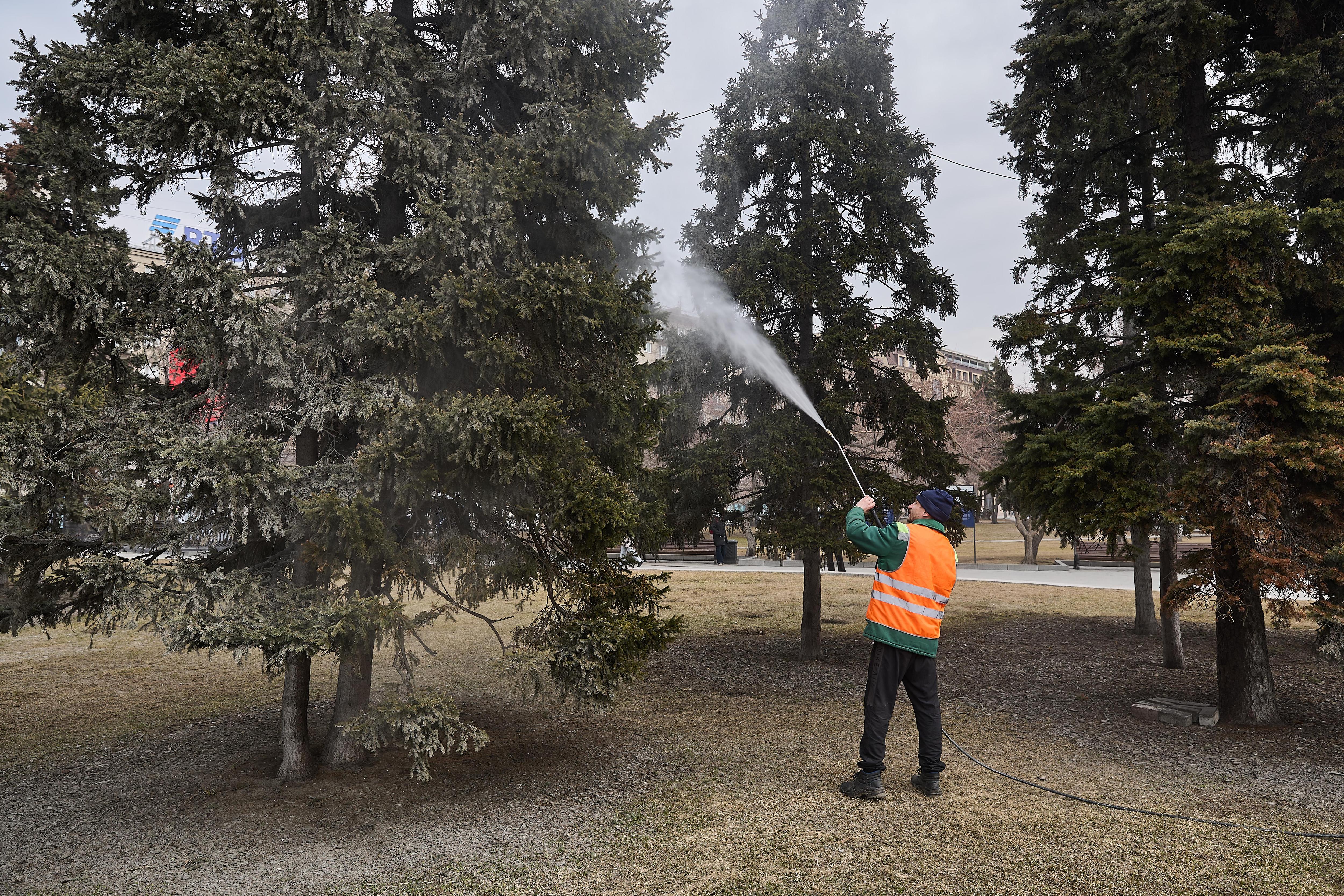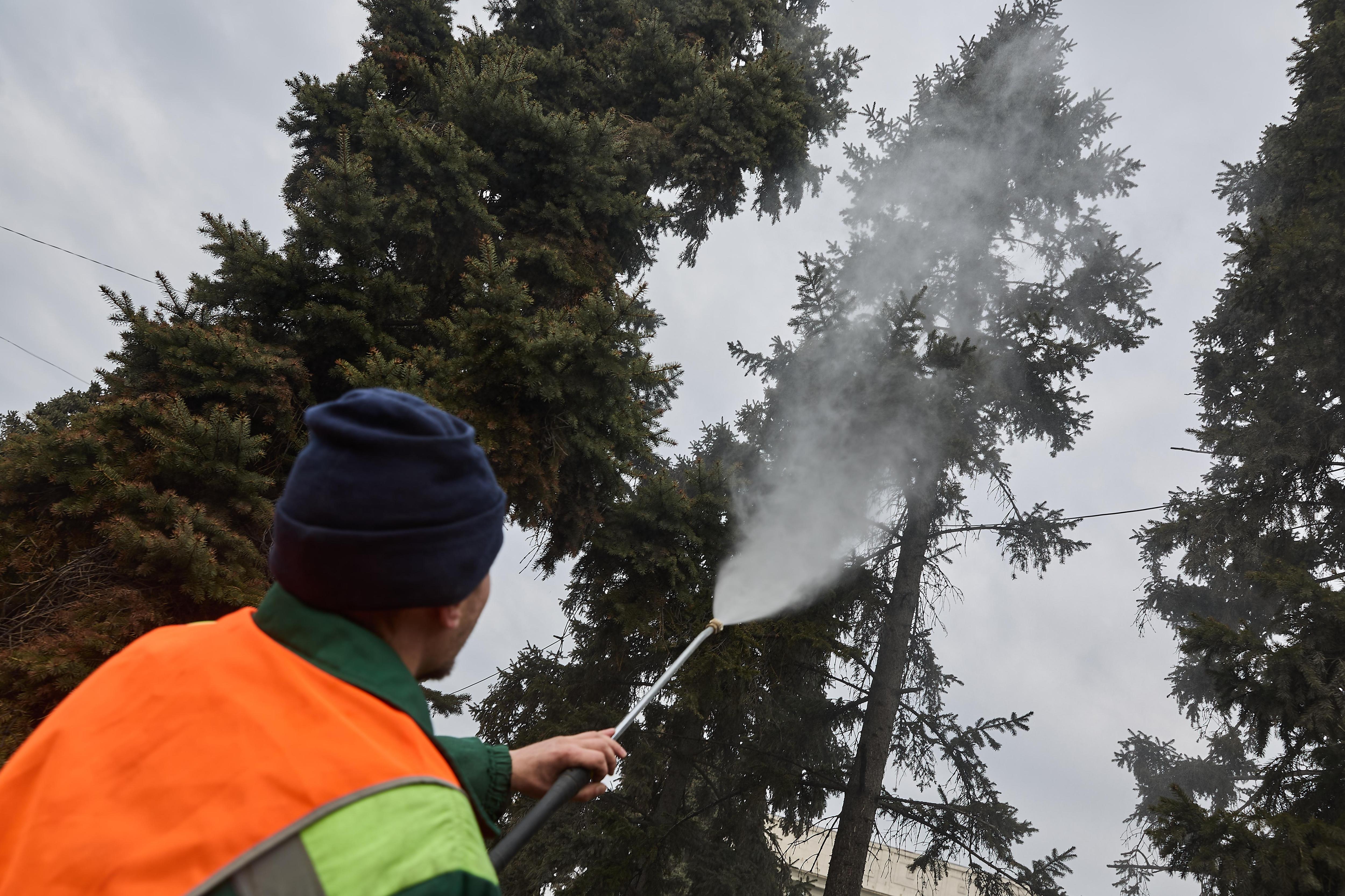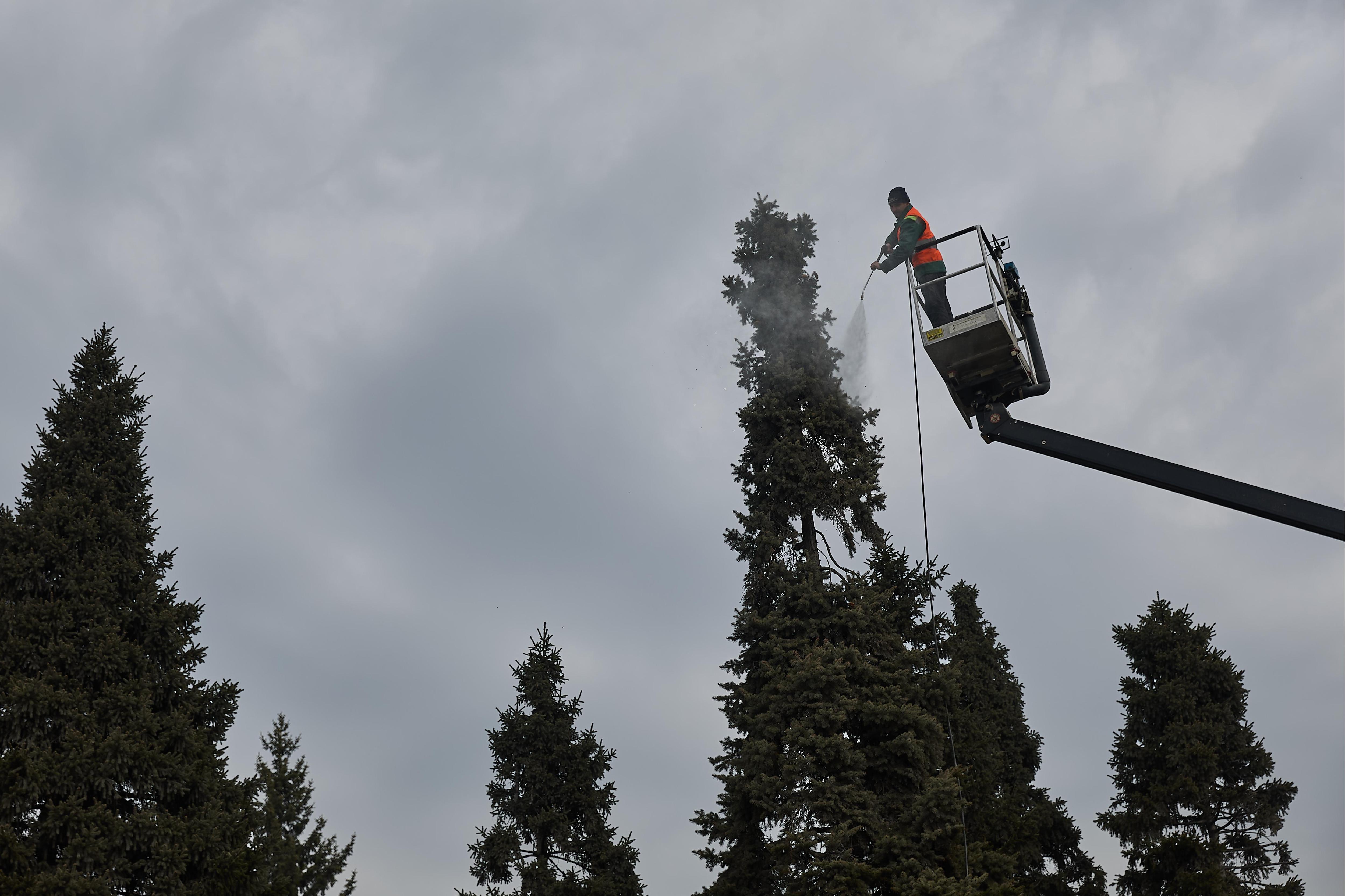 Для доступа к высоким ветвям используются автовышки и поливочные машины. Обработка одного дерева занимает примерно 15 минут и требует до 80 литров воды. Специальный мыльный раствор смывает грязь, старую хвою и личинки вредителей.
