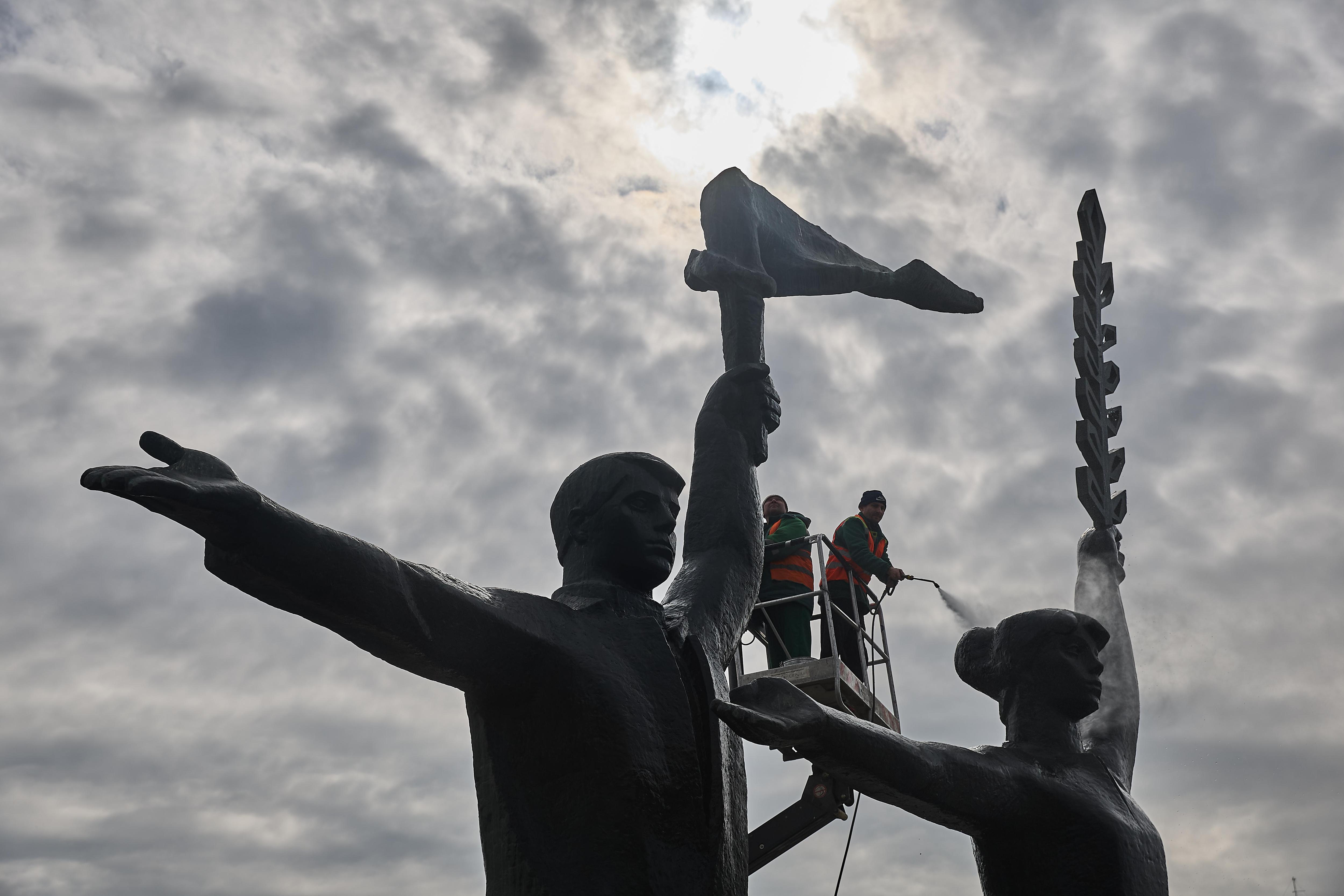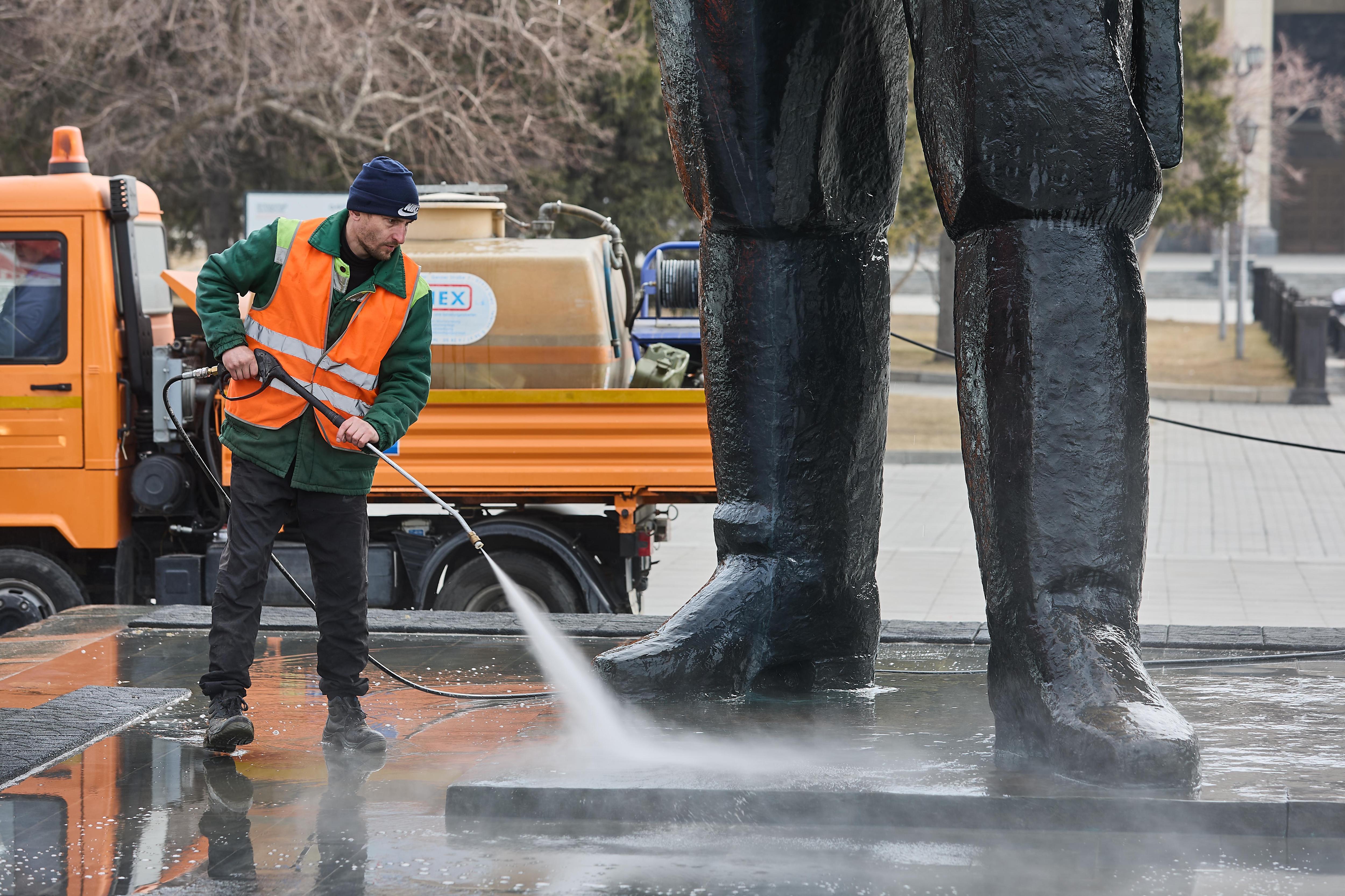 Параллельно в скверах и на площадях моют памятники и малые архитектурные формы. Струи воды под высоким давлением удаляют не только пыль, но и следы вандализма. Уже очищена скульптурная композиция на площади Ленина.