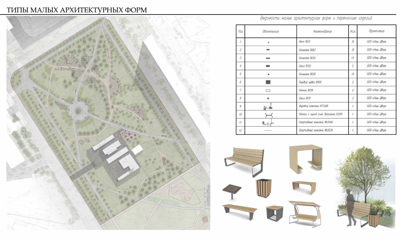 В перечне малых архитектурных форм значатся качели и навесы для создания тени.