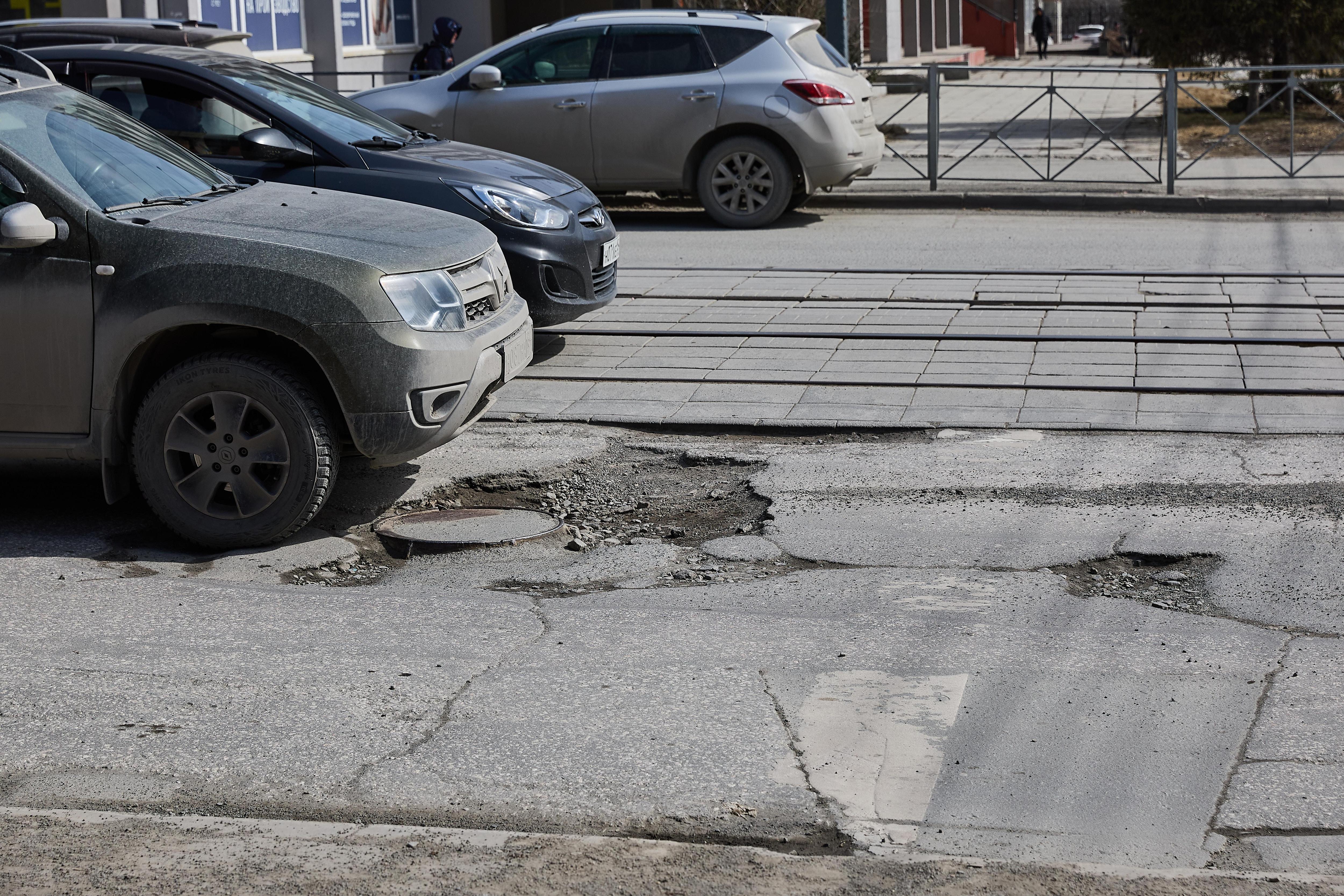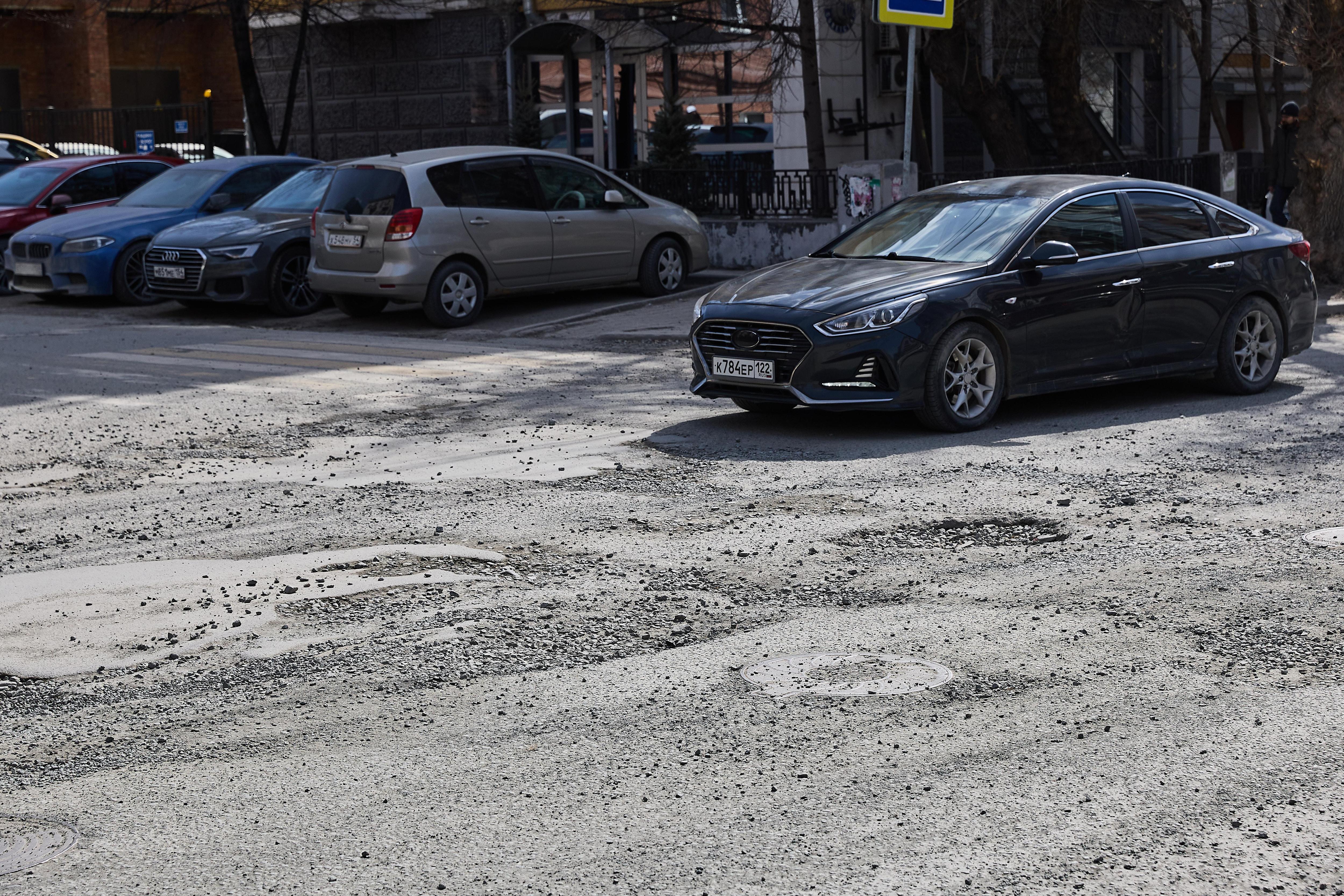Асфальтовое покрытие местами исчезло вместе со снегом, создавая глубокие выбоины, которые сложно объехать.