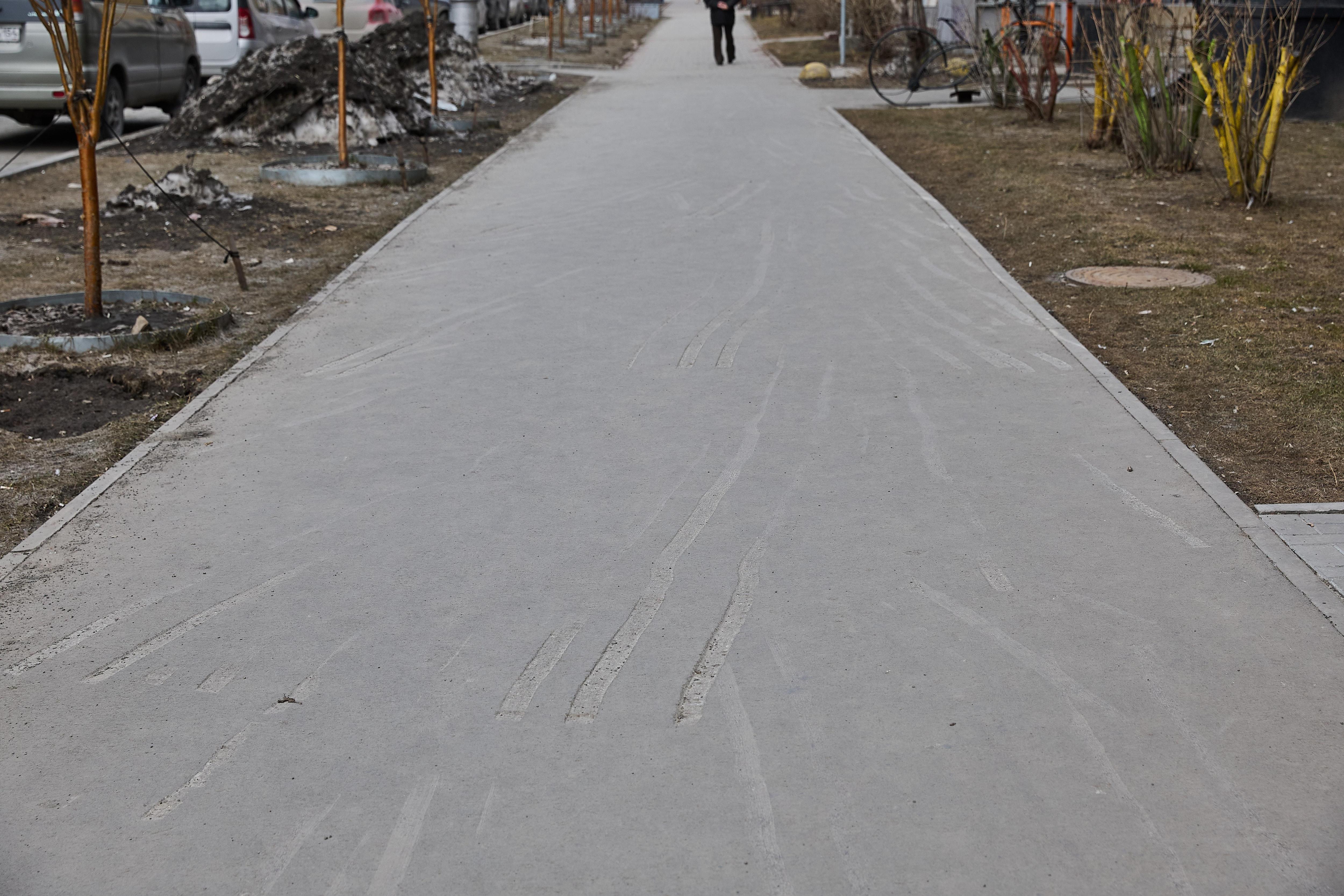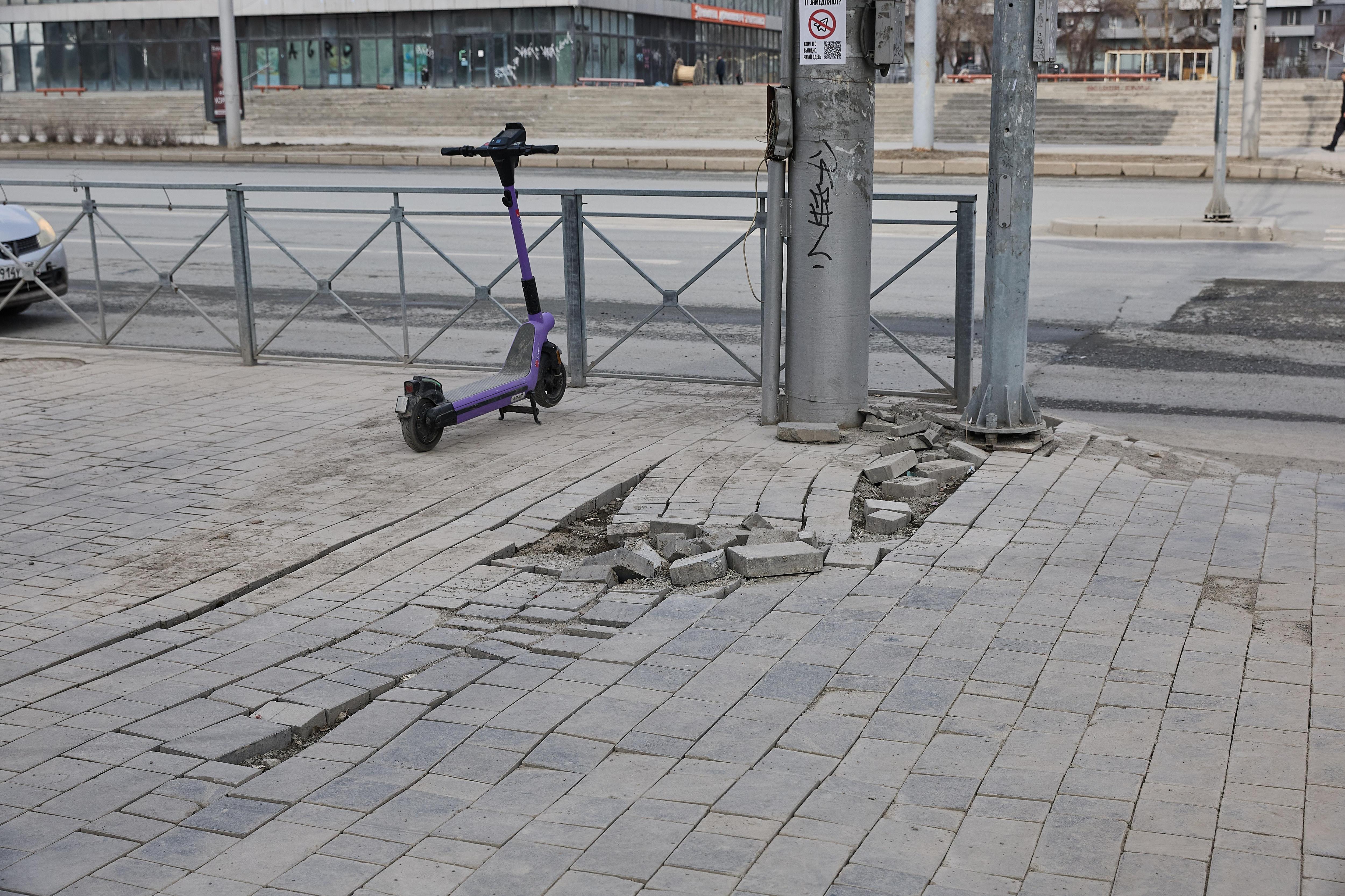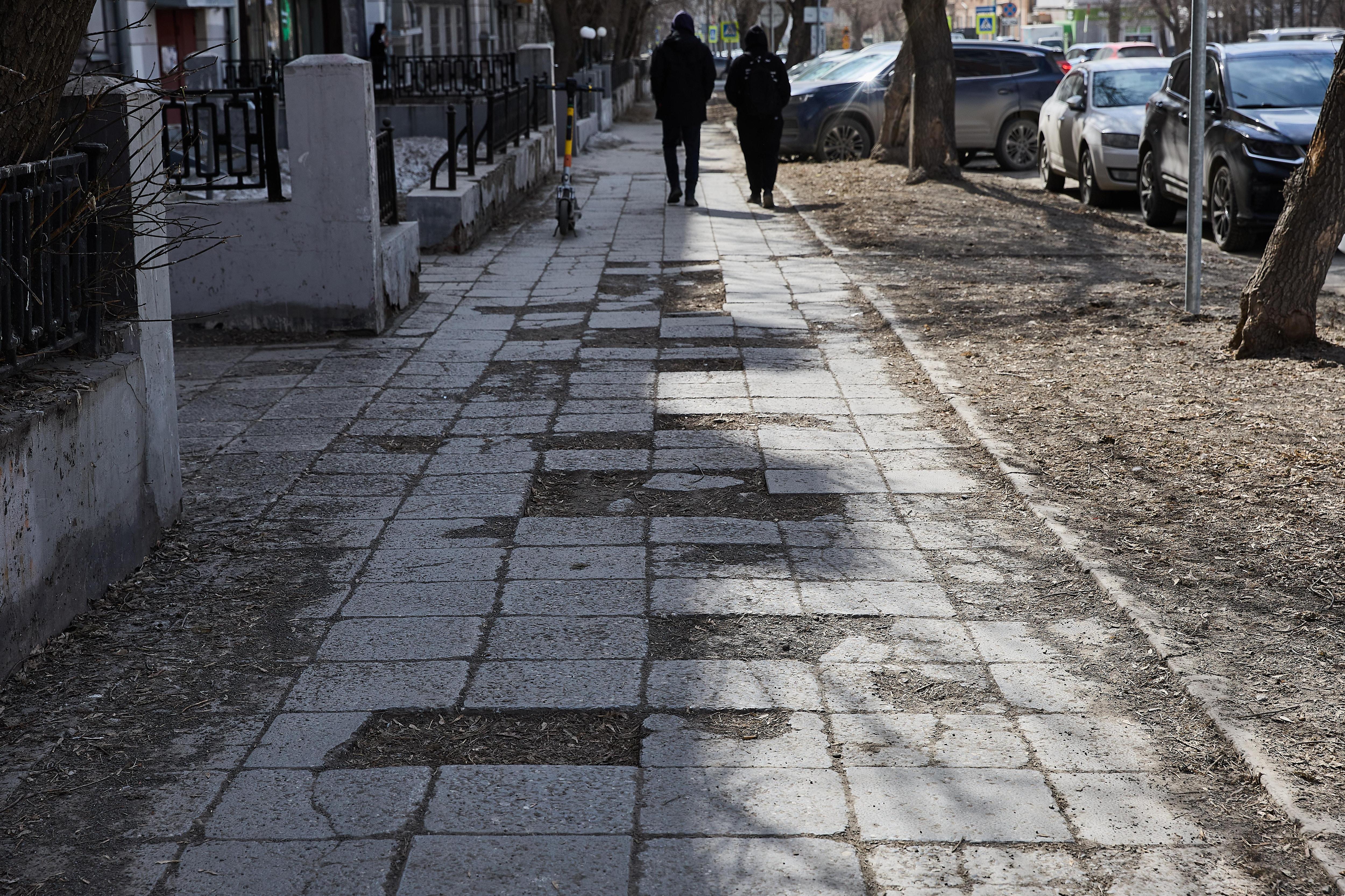На тротуарах образовались проплешины из-за отсутствующей плитки, напоминая клетки для игры в классики.