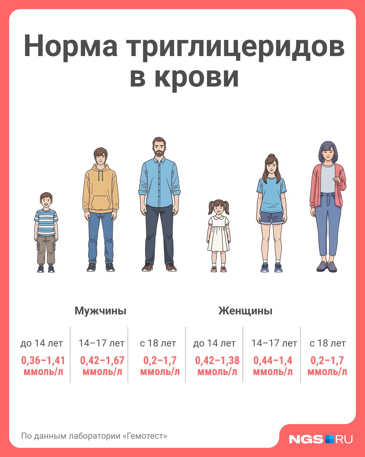 Нормальные значения триглицеридов варьируются в зависимости от пола и возраста. Для взрослых мужчин и женщин норма составляет от 0,2 до 1,7 ммоль/л. У детей и подростков до 18 лет показатели различаются.
