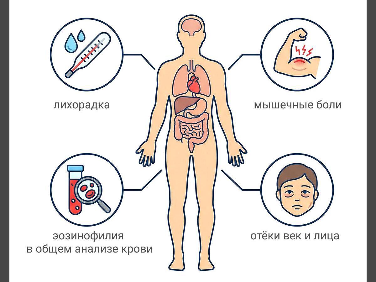 Основными признаками трихинеллеза считаются повышенная температура, болезненность в мышцах, эозинофилия в анализе крови, а также припухлость век и лица. В просторечии эту болезнь часто называют «одутловатка». При отсутствии медицинской помощи инфекция может привести к смерти.