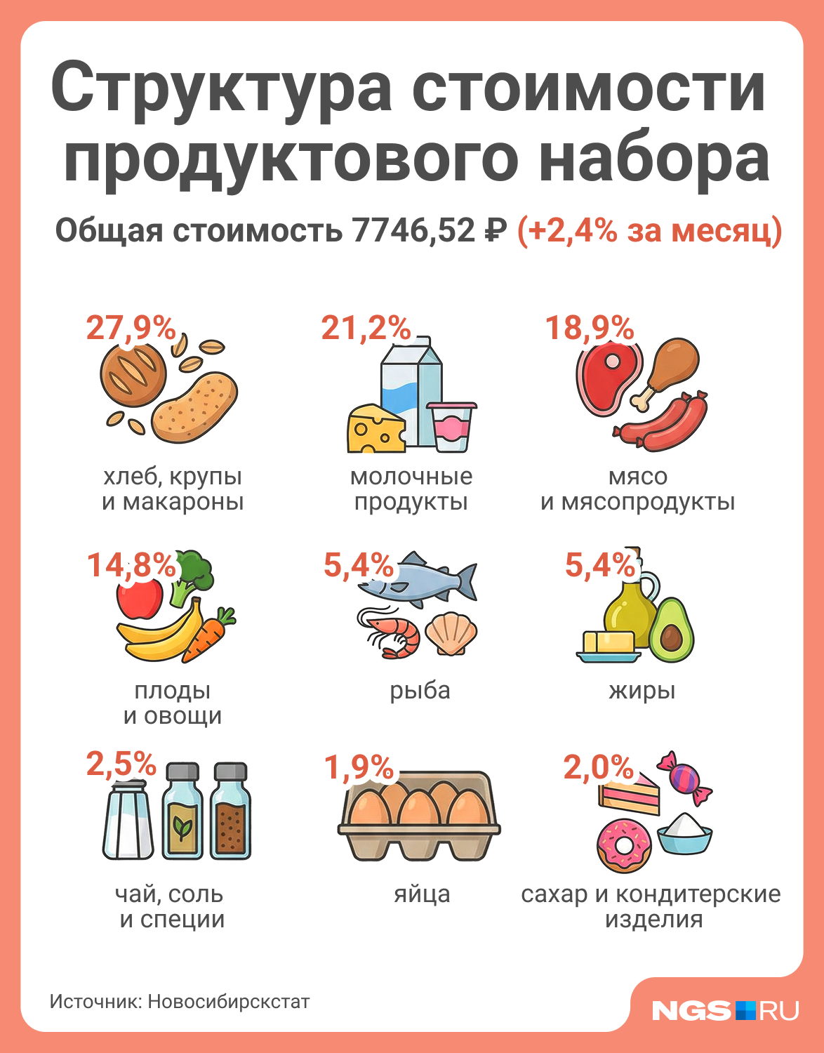 По данным Новосибирскстата, в январе 2026 года условный минимальный набор продуктов питания в Новосибирской области оценивался в 7746,52 рубля, что приближается к 8 тысячам рублей.