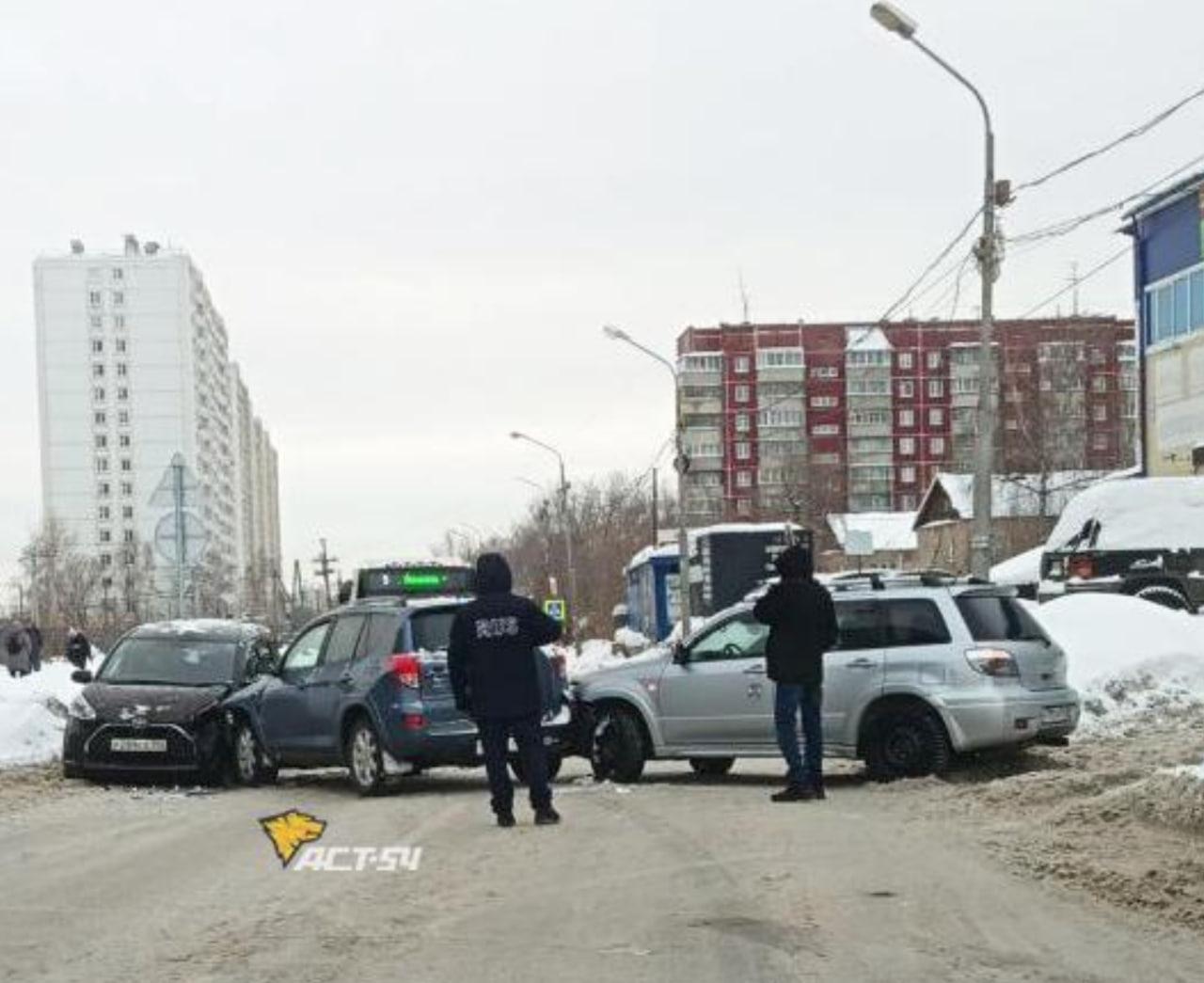 Три автомобиля столкнулись в Калининском районе Новосибирска, полностью заблокировав движение по улице Фадеева.