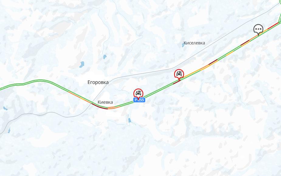 Данные с картографического сервиса 2ГИС указывают на осложнённое движение около деревни Киевка из-за ДТП.