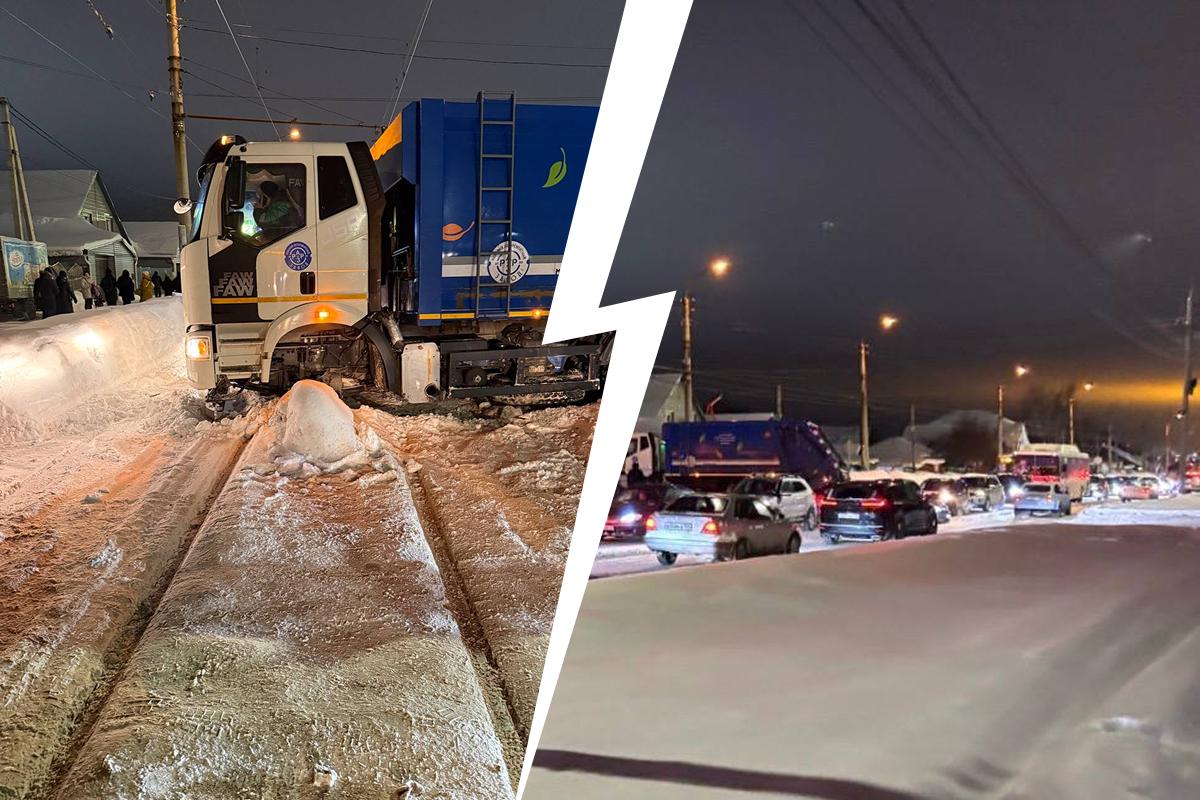 Застрявший на трамвайных путях мусоровоз вызвал пробку в Новосибирске вечером 23 декабря.