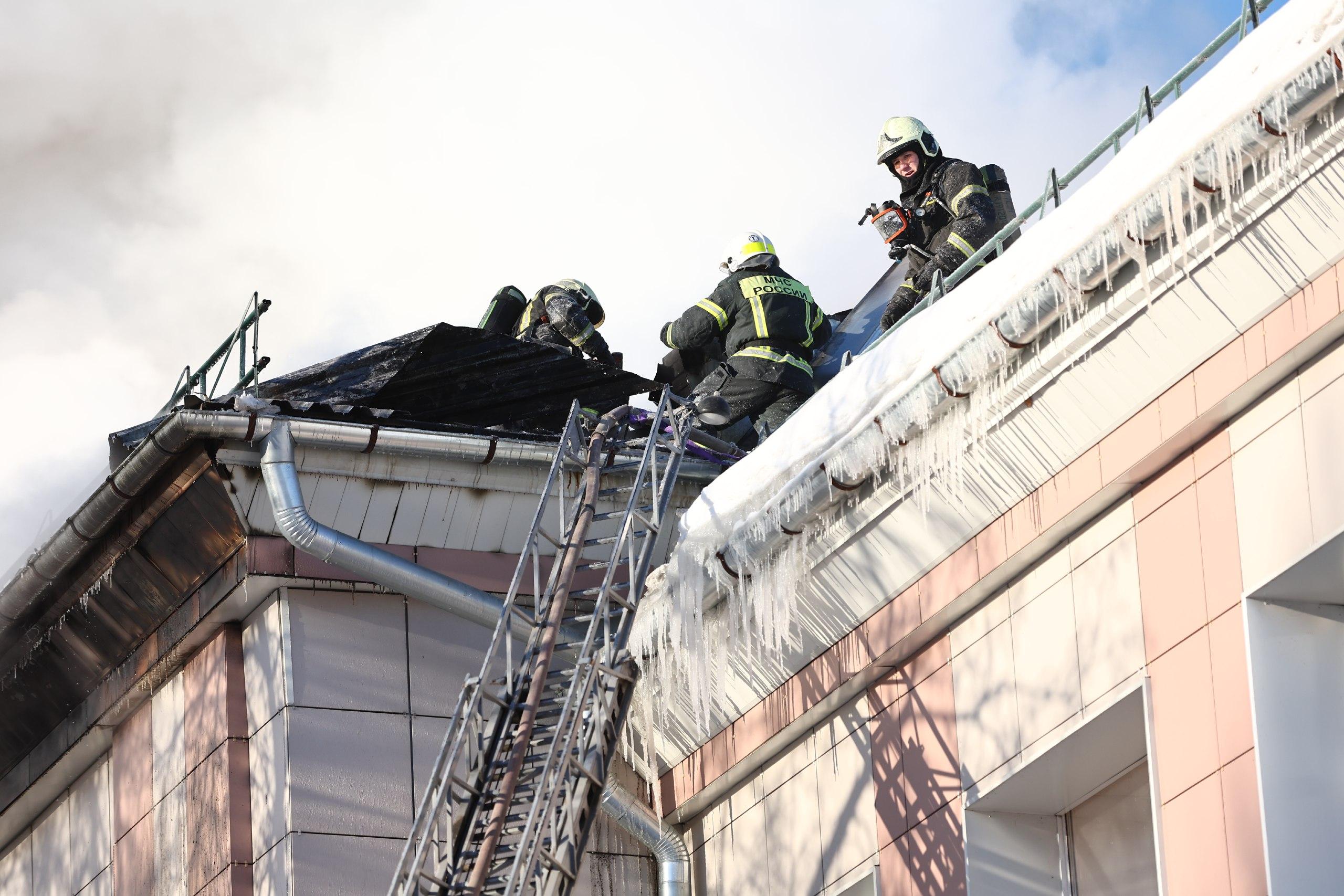 Пожарные продолжают работы по тушению огня на кровле учебного корпуса.
