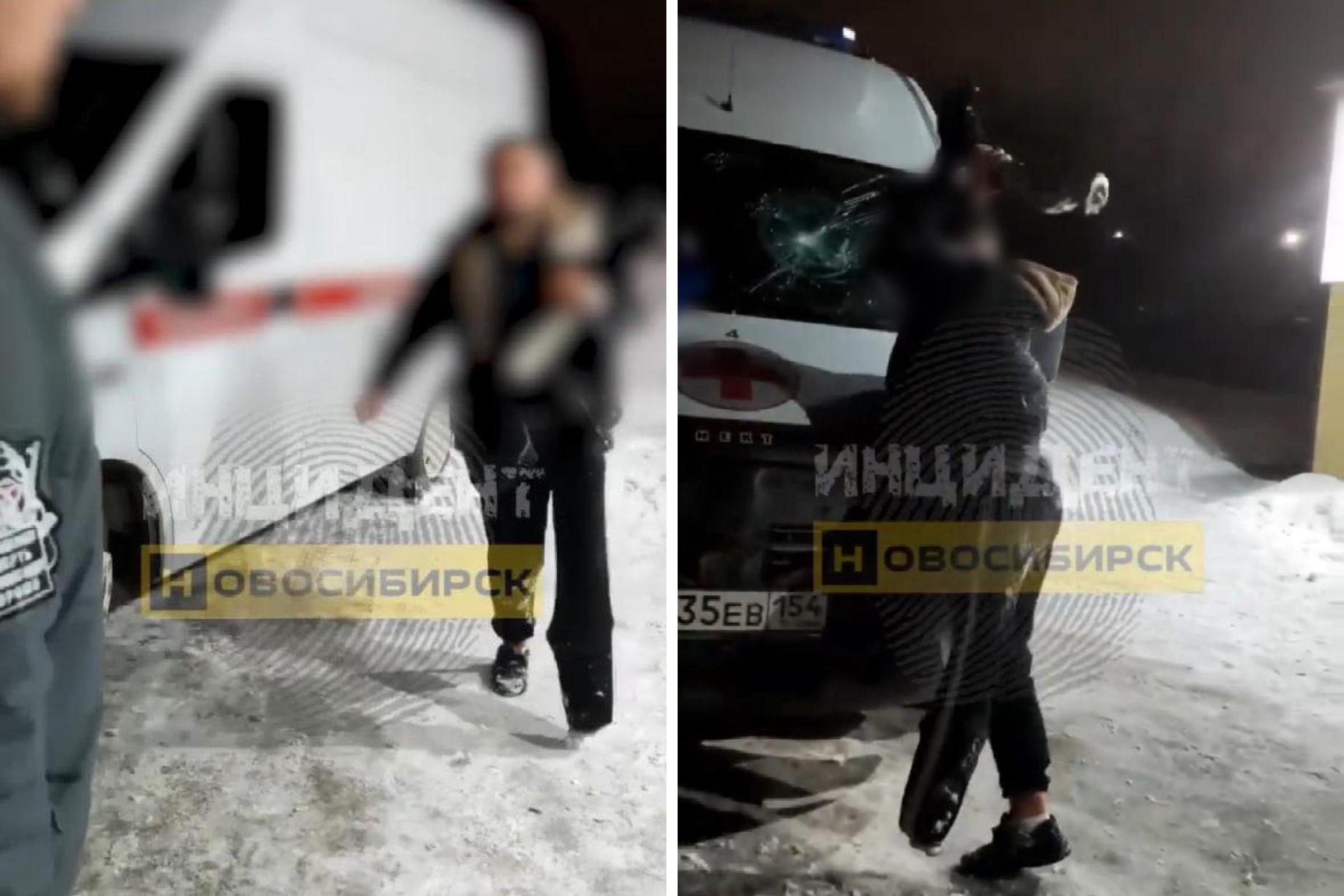 На опубликованных кадрах видно, как местный житель берет в руки собственный протез ноги и замахивается на одного из врачей. Впоследствии он этим же протезом разбивает лобовое стекло машины скорой помощи.