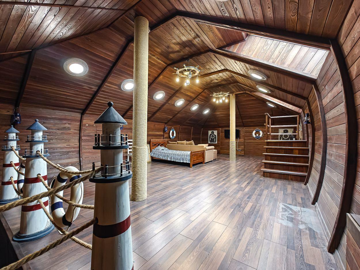 Мансарда стилизована под корабельный трюм. По словам продавца, это «романтичное пространство для подростков». В цокольном этаже есть бассейн, сауна и другие помещения.