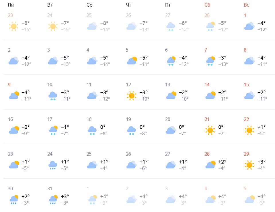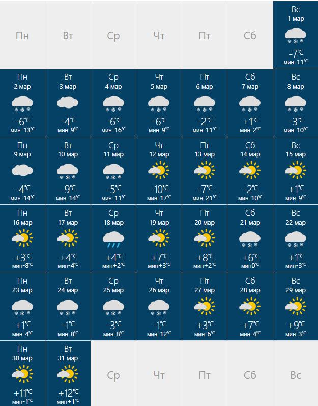 Сервис World Weather также ожидает потепление к концу месяца. По его данным, днем столбик термометра будет показывать от +3 до +15 градусов, ночью — от -24 до -1. Снегопады будут редкими, а самыми теплыми днями станут 30 и 31 марта.