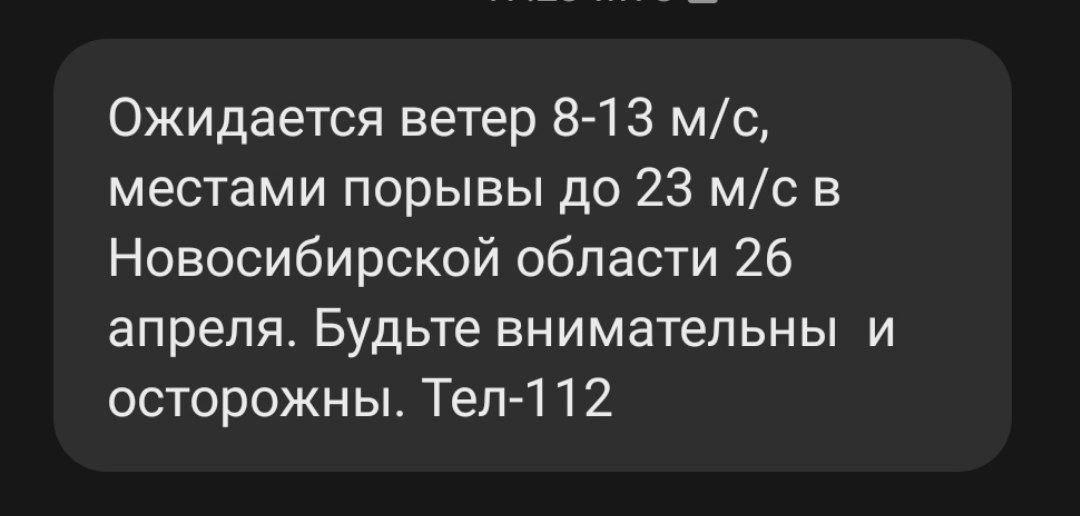 ГУ МЧС России по Новосибирской области направило на телефоны жителей СМС-предупреждение о приближающемся штормовом ветре.