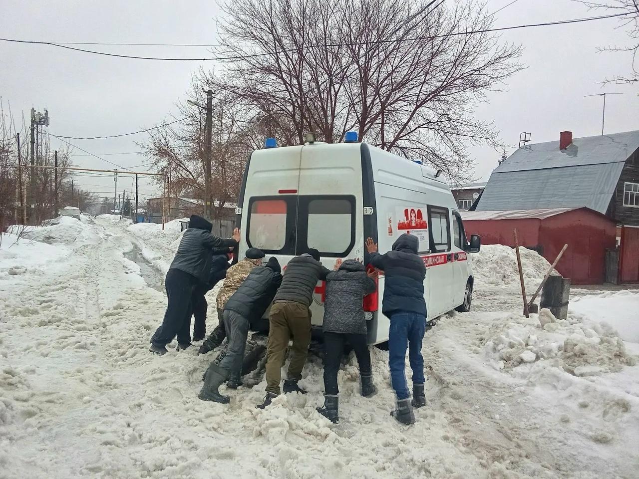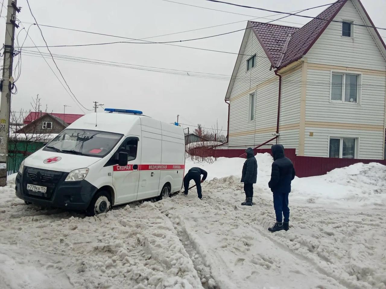 Сотрудникам и прохожим пришлось помогать вытащить застрявшую машину скорой помощи в Калининском районе.