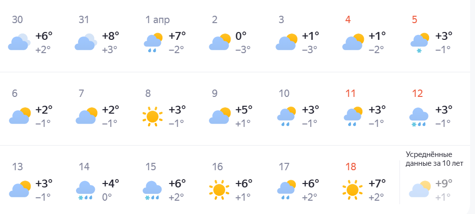 Сервис «Яндекс.Погода» сообщает о стабильных погодных условиях в первую половину месяца. Ночные температуры составят от -3 до +2 градусов, а днем воздух прогреется до 0… +7 градусов.