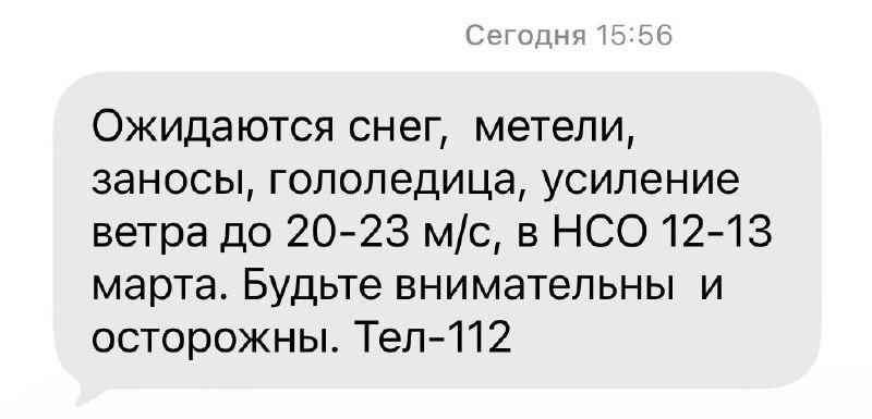Жителям Новосибирской области поступило SMS-оповещение от спасателей о значительном ухудшении погодных условий 12 и 13 марта.