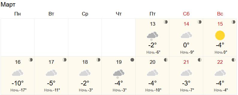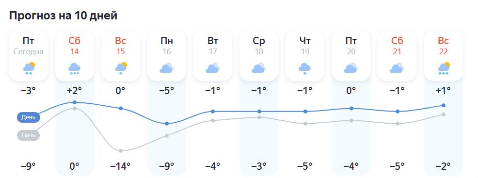 Прогноз от World Weather указывает на более низкие температуры в начале недели: в понедельник днем -10°C, ночью до -17°C. В среду потеплеет до -2°C, а в остальные дни температура не опустится ниже -5°C. Снег возможен в четверг.