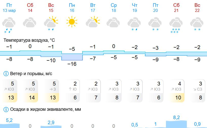 Согласно данным Gismeteo, в понедельник днем также ожидается -5°C, но ночью возможно похолодание до -16°C. В среду столбик термометра поднимется до 0°C. Осадки прогнозируются с четверга по воскресенье.