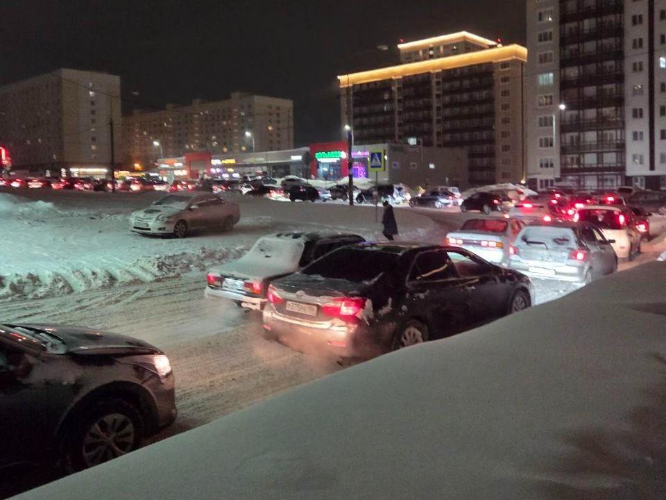 «На МЖК на улице Волочаевской неподалеку от перекрестка с улицей Лазурной — авария. Три ряда перегорожено, люди пытаются объехать по сугробам и парковкам, проехать не могут, автобус забуксовал. Движение перегорожено практически полностью. Я такого не видел здесь», — описывает ситуацию один из свидетелей.