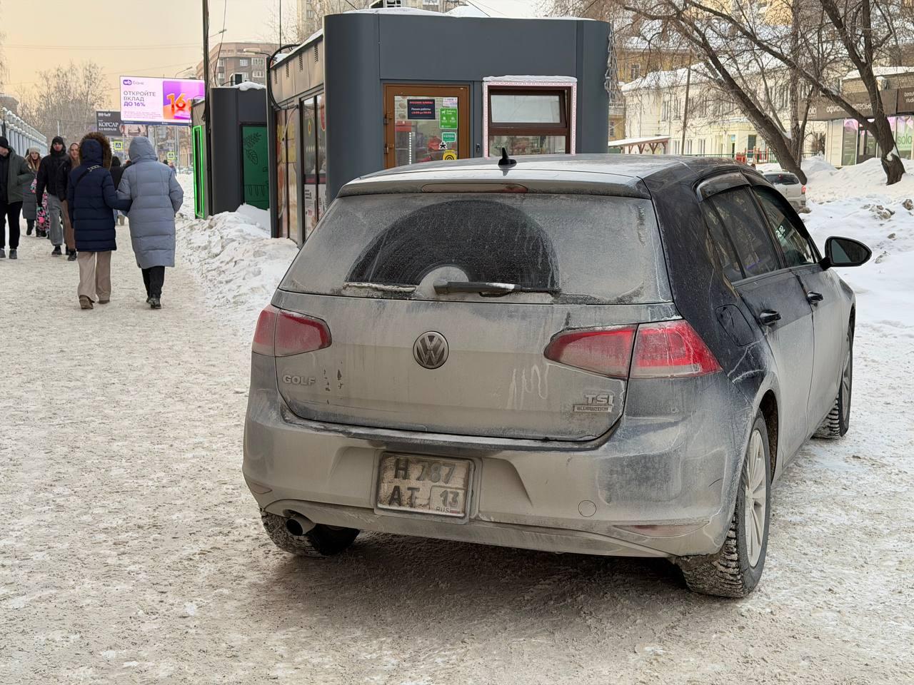 Тротуар в центре города на Орджоникидзе, 30 также регулярно страдает от автохамов. Любовь написала, что автомобилисты захватили почти всю пешеходную зону. Среди них — синий Volkswagen Golf 2014 года выпуска из Республики Мордовия, владелец которого не установлен.