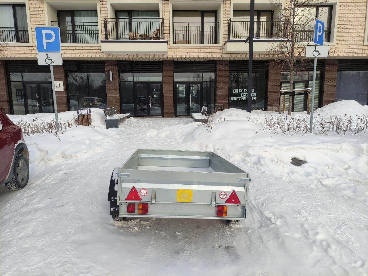 На улице Владимира Заровного, 34 парковочные места заняли прицепы. Жители в чате предполагают, что они относятся к автосалону, который ранее уже занимал места для инвалидов новыми автомобилями.