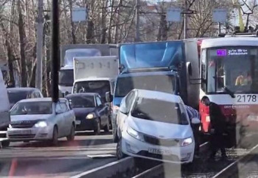 Из-за застрявшего автомобиля трамваи не могли проехать в одном направлении