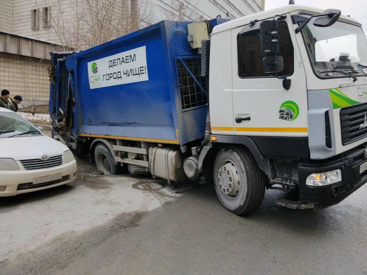 Мусоровоз застрял в асфальте на улице Октябрьской