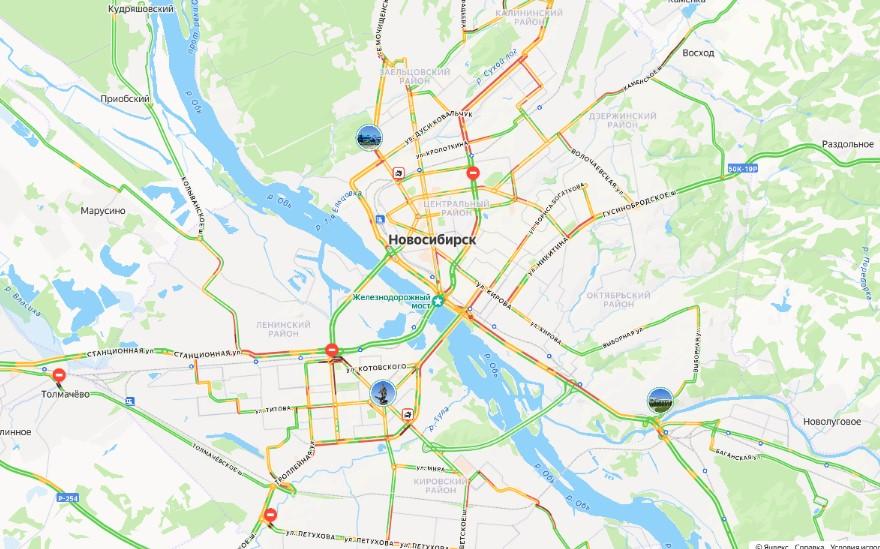 В левобережной части города сложная ситуация сложилась на улицах Петухова, Ватутина, Троллейной, Сибиряков-Гвардейцев, Большой и Станционной, а также на Винаповском мосту. Заторы наблюдаются и на площадях Энергетиков и Труда.