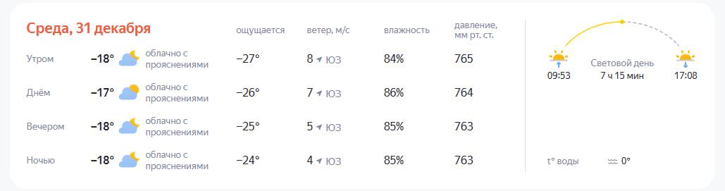 «Яндекс Погода» сообщает, что утром 31 декабря температура составит -18°C, но ощущаться будет как -27°C. Днем прогнозируется -17°C, а ночью — вновь -18°C.