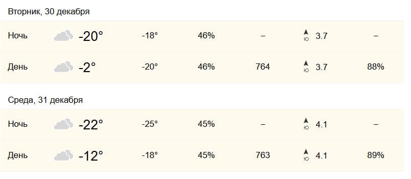Сервис World Weather прогнозирует перепад температуры в 20 градусов. Днем 30 декабря воздух прогреется до -2°C, а в ночь на 31 декабря столбик термометра опустится до -22°C. По ощущениям ночью будет -25°C. Днем 31 декабря температура поднимется до -12°C.
