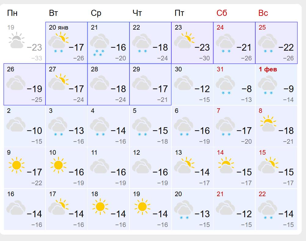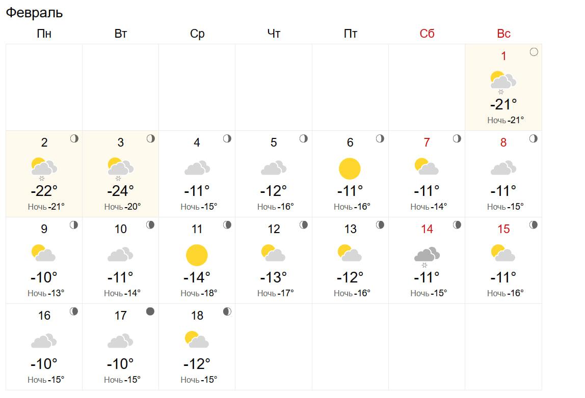 Самый холодный старт месяца прогнозирует сервис World-Weather. По его данным, в начале февраля температура опустится до -21… -24 градусов. Однако уже со второй недели ожидается резкое потепление: днём до -10… -12, ночью — примерно до -18 градусов.