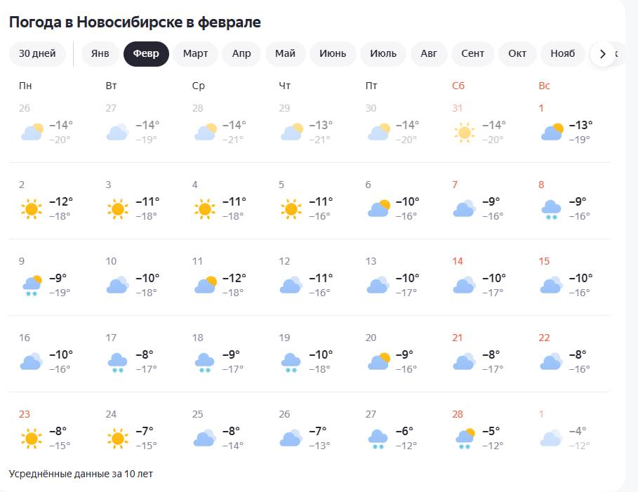 Погода в Новосибирске в феврале по прогнозам сервисов