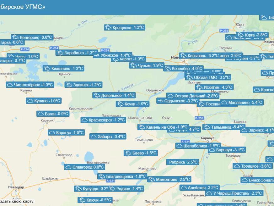 Данные погодной карты показывают, что наиболее тепло было в селе Хабары, где термометры показали -0,4°C. В Усть-Тарке воздух прогрелся до -0,6°C, в Татарске — до -0,7°C. В Венгерово и Багане температуры составили -0,8°C и -0,9°C соответственно.